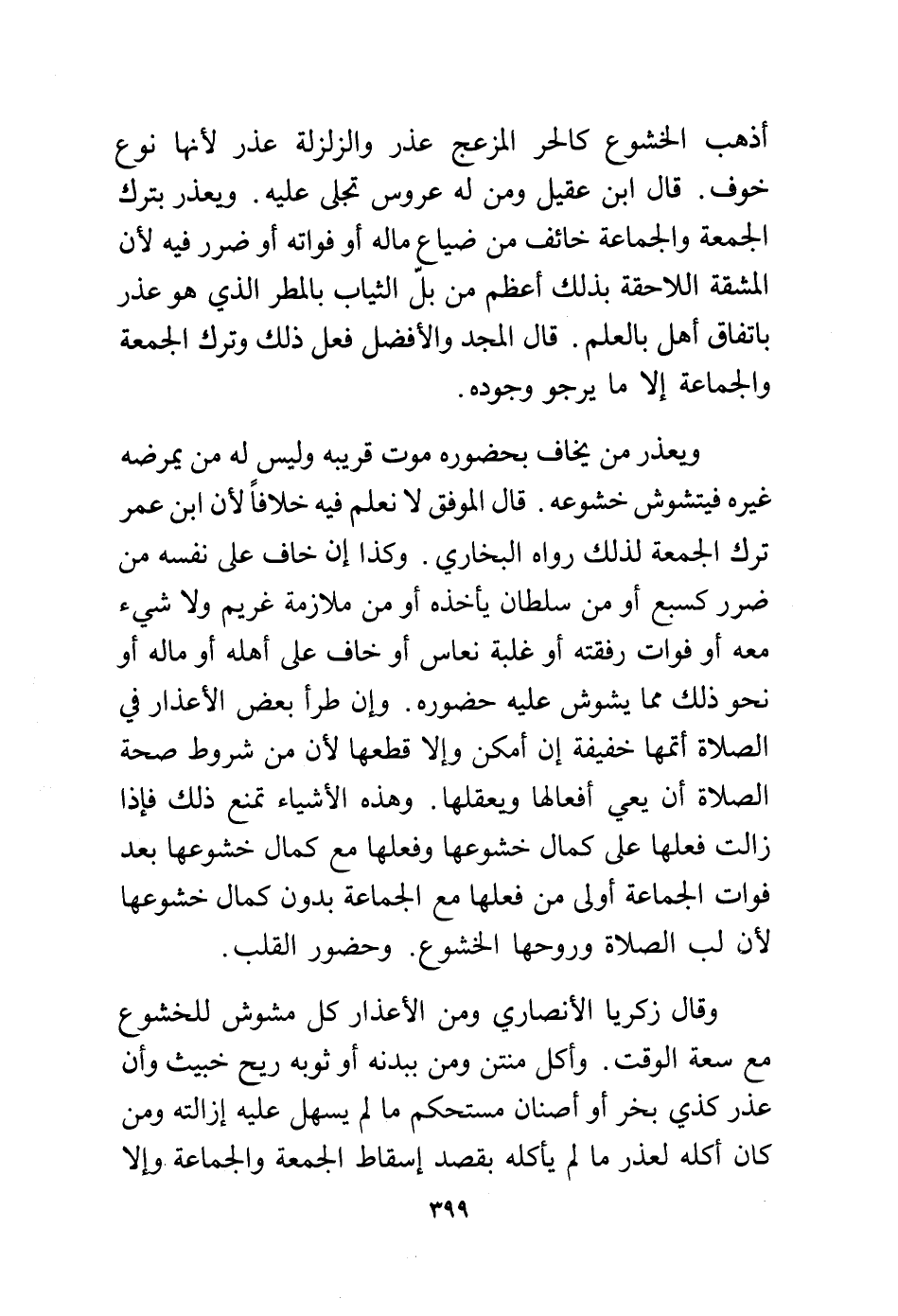 ويعذر من يخاف بحضوره موت قريبه وليس له من يمرضه غيره فيتشوش خشوعه. قال الموفق لا نعلم فيه خلافًا لأن ابن عمر ترك الجمعة لذلك رواه البخاري. وكذا إن خاف على نفسه من ضرر كسبع أو من سلطان يأخذه أو من ملازمة غريم ولا شيء معه أو فوات رفقته أو غلبة نعاس أو خاف على أهله أو ماله أو نحو ذلك مما يشوش عليه حضوره. وإن طرأ بعض الأعذار في الصلاة أتمها خفيفة إن أمكن وإلا قطعها لأن من شروط صحة الصلاة أن يعي أفعالها ويعقلها. وهذه الأشياء تمنع ذلك فإذا زالت فعلها على كمال خشوعها وفعلها مع كمال خشوعها بعد فوات الجماعة أولى من فعلها مع الجماعة بدون كمال خشوعها لأن لب الصلاة وروحها الخشوع. وحضور القلب.