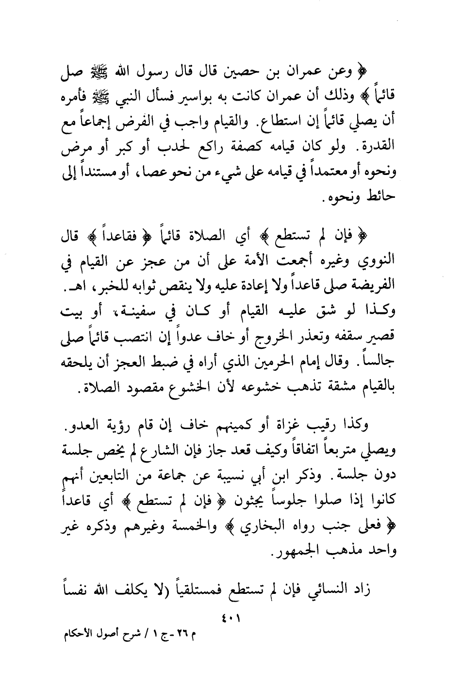 (وعن عمران بن حصين قال قال رسول الله – - صلى الله عليه وسلم - صل قائمًا) وذلك أن عمران كانت به بواسير فسأل النبي – - صلى الله عليه وسلم - فأمره أن يصلي قائمًا إن استطاع. والقيام واجب في الفرض إجماعًا مع القدرة. ولو كان قيامه كصفة راكع لحدب أو كبر أو مرض ونحوه أو معتمدًا في قيامه على شيء من نحو عصا، أو مستندًا إلى حائط ونحوه.