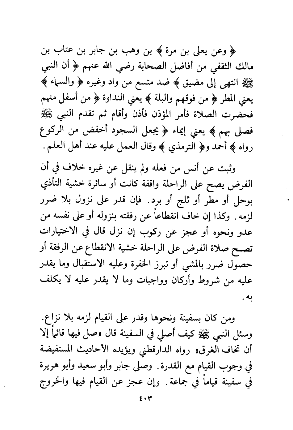 ومن كان بسفينة ونحوها وقدر على القيام لزمه بلا نزاع. وسئل النبي – - صلى الله عليه وسلم - كيف أصلي في السفينة قال "صل فيها قائمًا إلا أن تخاف الغرق" رواه الدارقطني ويؤيده الأحاديث المستفيضة في وجوب القيام مع القدرة. وصلى جابر وأبو سعيد وأبو هريرة في سفينة قيامًا في جماعة. وإن عجز عن القيام فيها والخروج