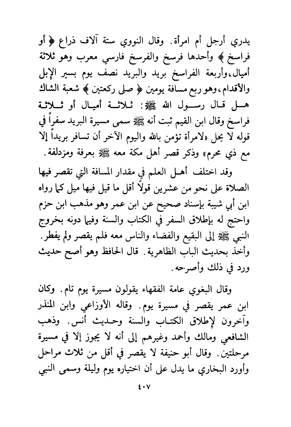 يدري أرجل أم امرأة. وقال النووي ستة آلاف ذراع (أو فراسخ) وأحدها فرسخ والفرسخ فارسي معرب وهو ثلاثة أميال، وأربعة الفراسخ بريد والبريد نصف يوم بسير الإبل والأقدام، وهو ربع مسافة يومين (صلى ركعتين) شعبة الشاك هل قال رسول الله – - صلى الله عليه وسلم - ثلاثة أميال أو ثلاثة فراسخ وقال ابن القيم ثبت أنه – - صلى الله عليه وسلم - سمى مسيرة البريد سفرًا في قوله لا يحل "لامرأة تؤمن بالله واليوم الآخر أن تسافر بريدًا إلا مع ذي محرم" وذكر قصر أهل مكة معه – - صلى الله عليه وسلم - بعرفة ومزدلفة.