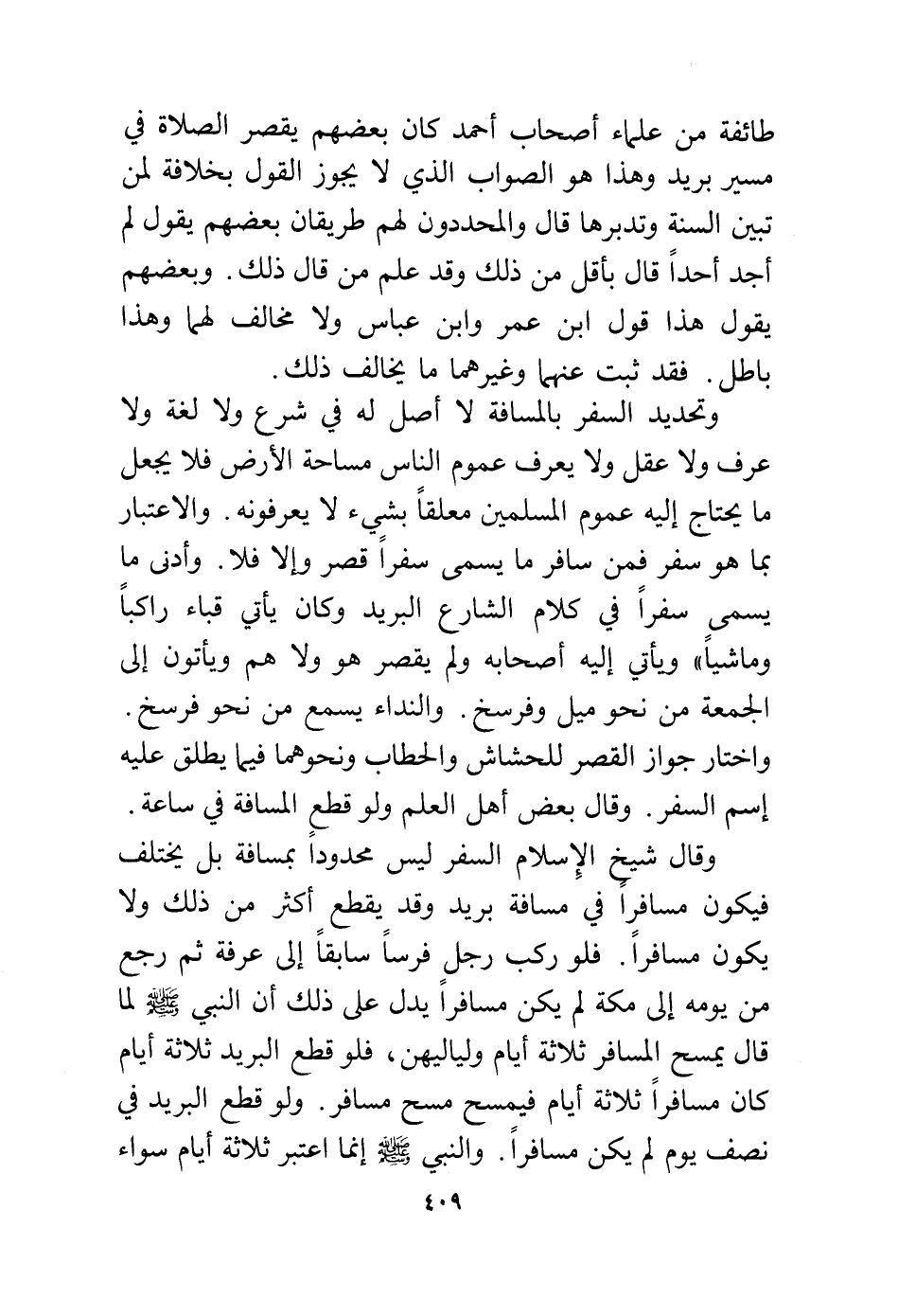 طائفة من علماء أصحاب أحمد كان بعضهم يقصر الصلاة في مسير بريد وهذا هو الصواب الذي لا يجوز القول بخلافه لمن تبين السنة وتدبرها قال والمحددون لهم طريقان بعضهم يقول لم أجد أحدًا قال بأقل من ذلك وقد علم من قال ذلك. وبعضهم يقول هذا قول ابن عمر وابن عباس ولا مخالفه لهما وهذا باطل. فقد ثبت عنهما وغيرهما ما يخالف ذلك.