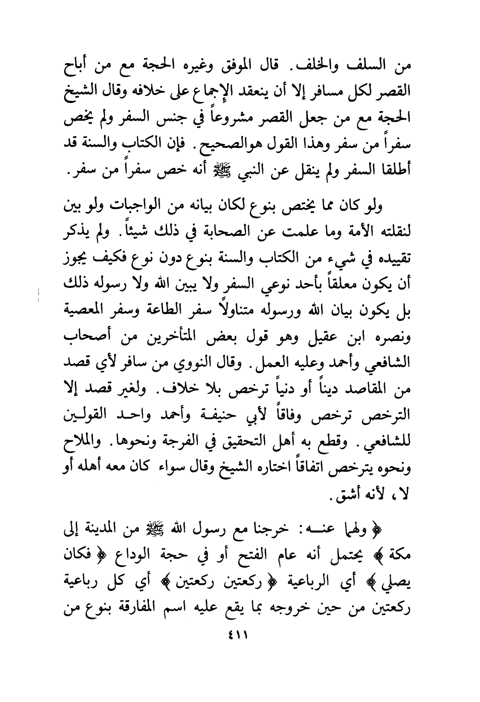 من السلف والخلف. قال الموفق وغيره الحجة مع من أباح القصر لكل مسافر إلا أن ينعقد الإجماع على خلافه وقال الشيخ الحجة مع من جعل القصر مشروعًا في جنس السفر ولم يخص سفرًا من سفر وهذا القول هو الصحيح. فإن الكتاب والسنة قد أطلقا السفر ولم ينقل عن النبي – - صلى الله عليه وسلم - أنه خص سفرًا من سفر.