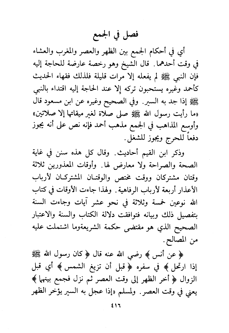 أي في أحكام الجمع بين الظهر والعصر والمغرب والعشاء في وقت أحدهما. قال الشيخ وهو رخصة عارضة للحاجة إليه فإن النبي – - صلى الله عليه وسلم - لم يفعله إلا مرات قليلة فلذلك فقهاء الحديث كأحمد وغيره يستحبون تركه إلا عند الحاجة إليه اقتداء بالنبي – - صلى الله عليه وسلم - إذا جد به السير. وفي الصحيح وغيره عن ابن مسعود قال "ما رأيت رسول الله – - صلى الله عليه وسلم - صلى صلاة لغير ميقاتها إلا صلاتين" وأوسع المذاهب في الجمع مذهب أحمد فإنه نص على أنه يجوز دفعًا للحرج ويجوز للشغل.
