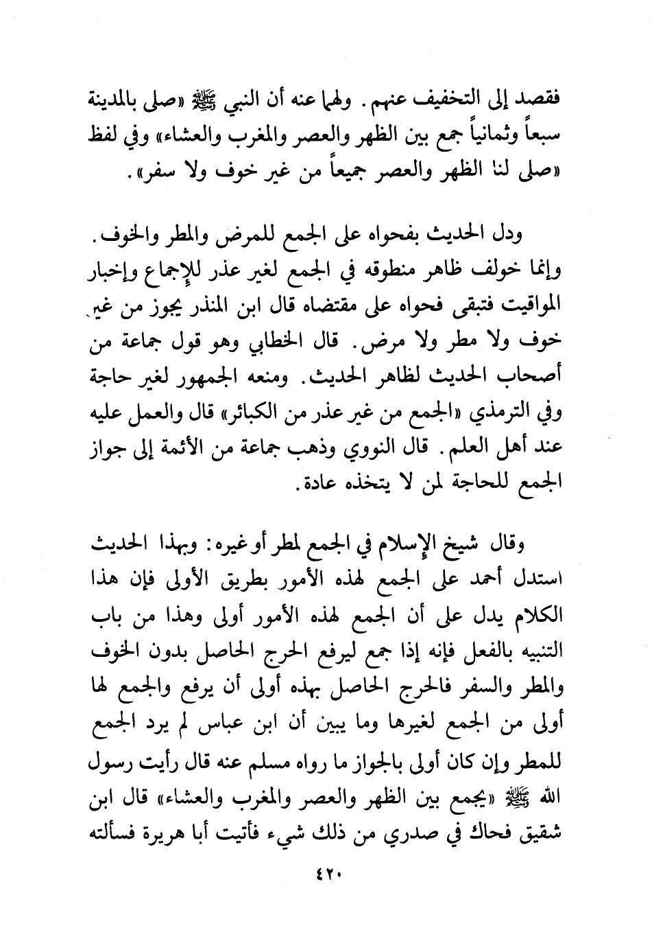 وقال شيخ الإسلام في الجمع لمطر أو غيره: وبهذا الحديث استدل أحمد على الجمع لهذه الأمور بطريق الأولى فإن هذا الكلام يدل على أن الجمع لهذه الأمور أولى وهذا من باب التنبيه بالفعل فإنه إذا جمع ليرفع الحرج الحاصل بدون الخوف والمطر والسفر، فالحرج الحاصل بهذه أولى أن يرفع والجمع لها أولى من الجمع لغيرها وما يبين أن ابن عباس لم يرد الجمع للمطر وإن كان أولى بالجواز ما رواه مسلم عنه قال رأيت رسول الله - صلى الله عليه وسلم - "يجمع بين الظهر والعصر والمغرب والعشاء" قال ابن شقيق فحاق في صدري من ذلك شيء فأتيت أبا هريرة فسألته