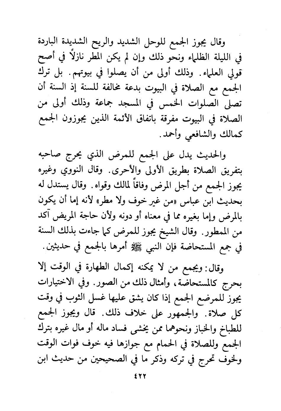 وقال يجوز الجمع للوحل الشديد والريح الشديدة الباردة في الليلة الظلماء ونحو ذلك وإن لم يكن المطر نازلاً في أصح قولي العلماء. وذلك أولى من أن يصلوا في بيوتهم. بل ترك الجمع مع الصلاة في البيوت بدعة مخالفة للسنة إذ السنة أن تصلي الصلوات الخمس في المسجد جماعة وذلك أولى من الصلاة في البيوت مفرقة باتفاق الأئمة الذين يجوزون الجمع كمالك والشافعي وأحمد.