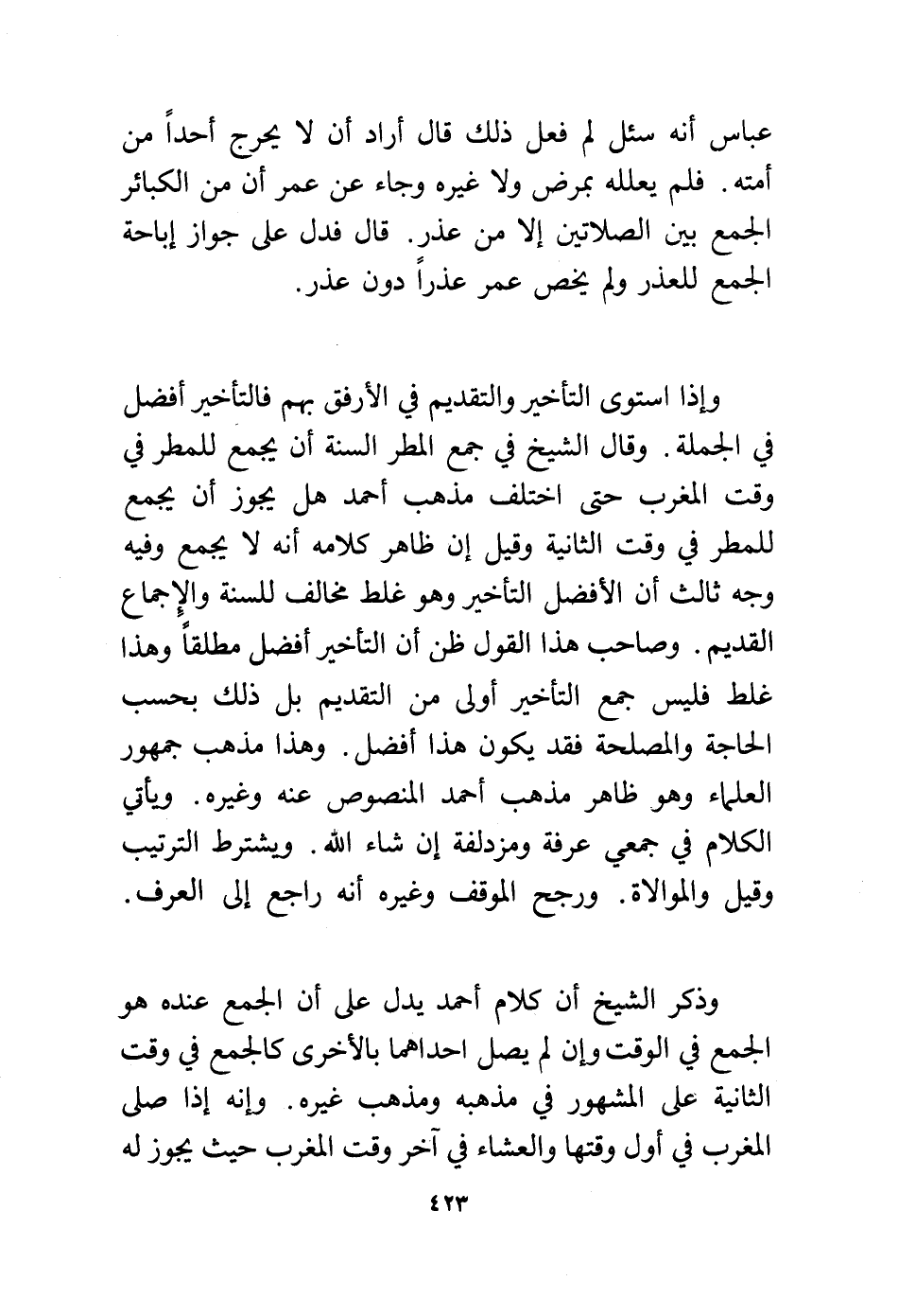 وذكر الشيخ أن كلام أحمد يدل على أن الجمع عنده هو الجمع في الوقت وإن لم يصل إحداهما بالأخرى كالجمع في وقت الثانية على المشهور في مذهبه ومذهب غيره. وإنه إذا صلى المغرب في أول وقتها والعشاء في آخر وقت المغرب حيث يجوز له