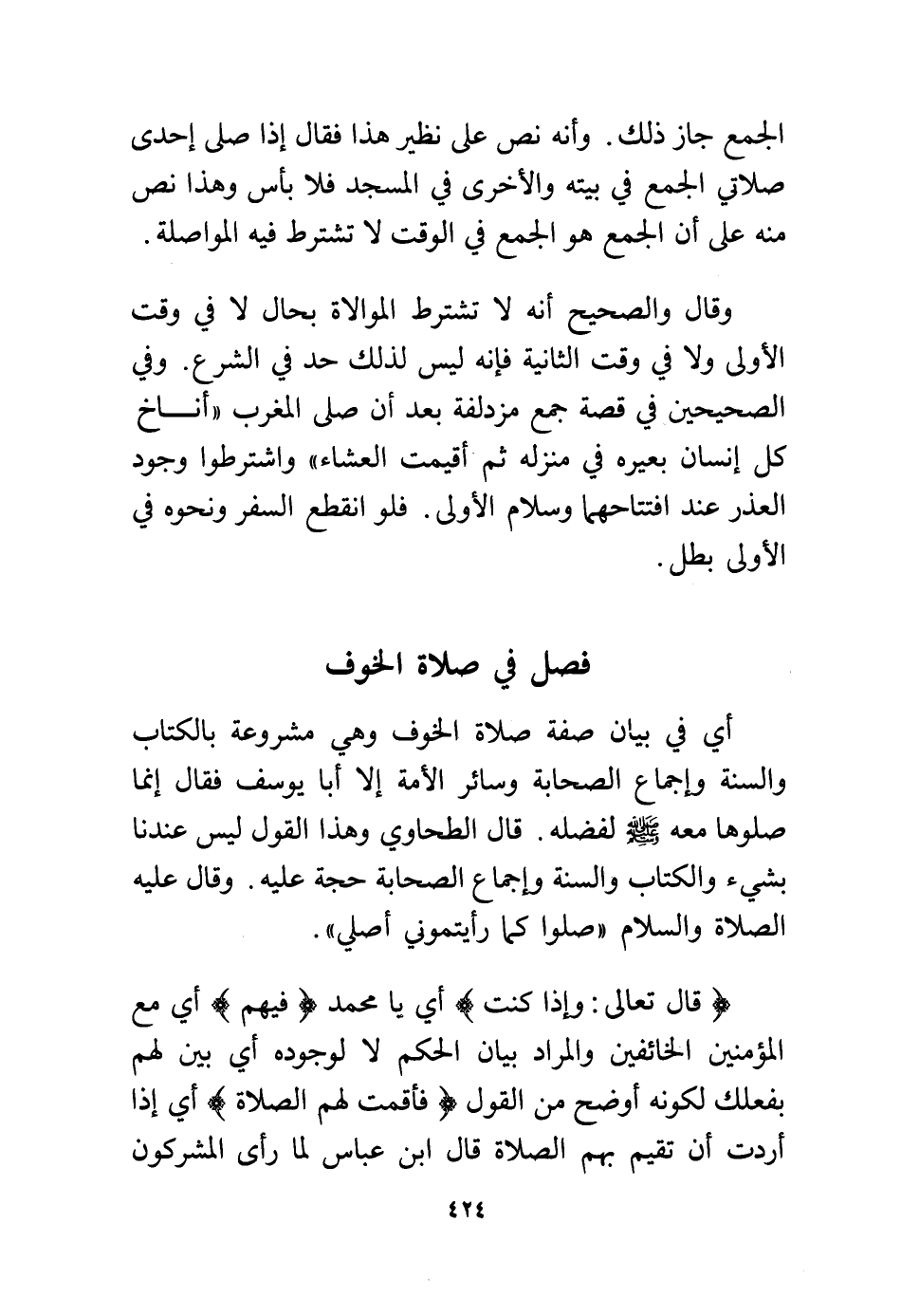 أي في بيان صفة صلاة الخوف وهي مشروعة بالكتاب والسنة وإجماع الصحابة وسائر الأمة إلا أبا يوسف فقال إنما صلوها معه – - صلى الله عليه وسلم - – لفضله. قال الطحاوي وهذا القول ليس عندنا بشيء والكتاب والسنة وإجماع الصحابة حجة عليه وقال عليه الصلاة والسلام "صلوا كما رأيتموني أصلي".