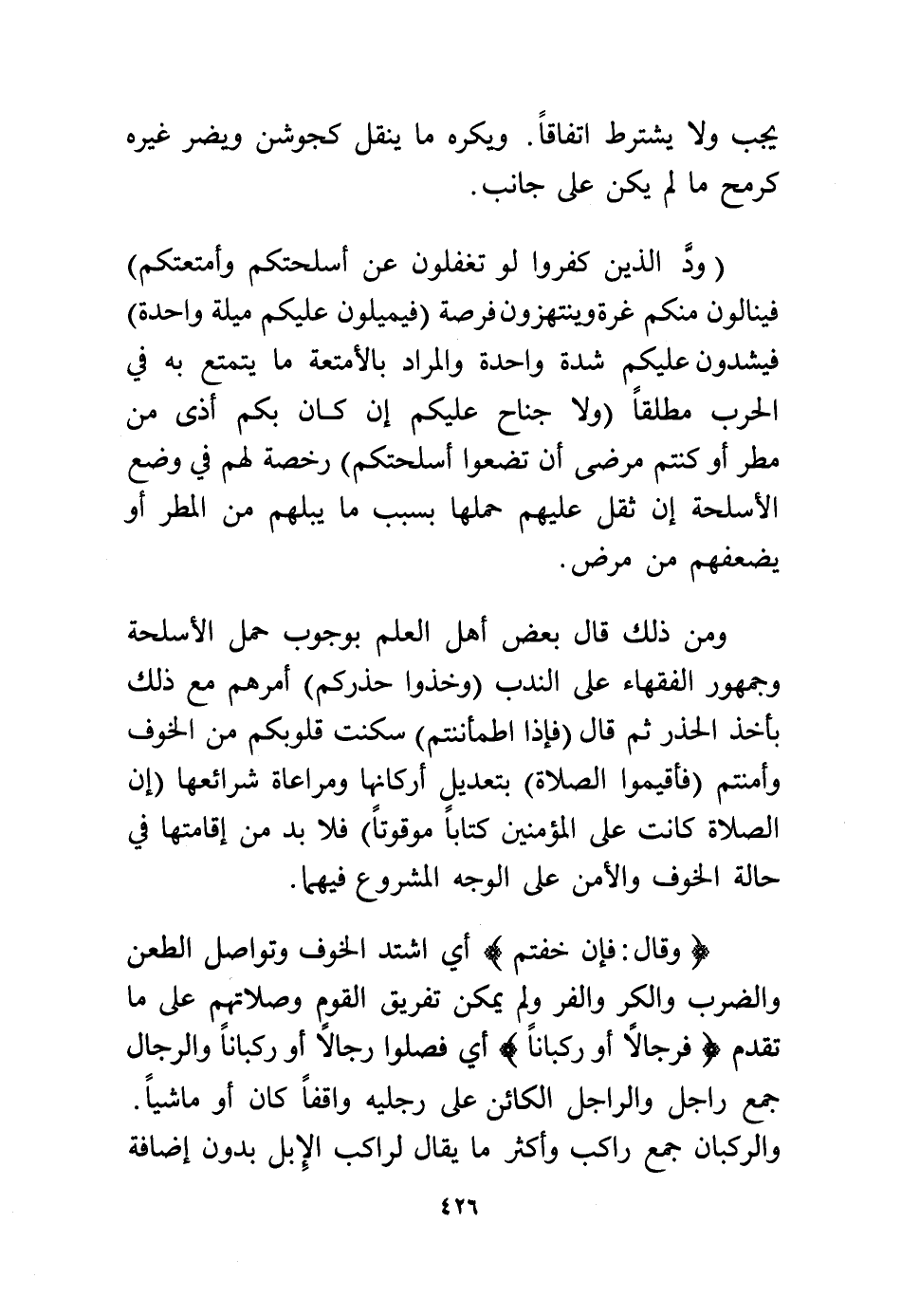 ومن ذلك قال بعض أهل العلم بوجوب حمل الأسلحة وجمهور الفقهاء على الندب {وَخُذُواْ حِذْرَكُمْ} أمرهم مع ذلك بأخذ الحذر ثم قال {فَإِذَا اطْمَأْنَنتُمْ} سكنت قلوبكم من الخوف وأمنتم {فَأَقِيمُواْ الصَّلاَةَ} بتعديل أركانها ومراعاة شرائعها {إِنَّ الصَّلاَةَ كَانَتْ عَلَى الْمُؤْمِنِينَ كِتَابًا مَّوْقُوتًا} فلا بد من إقامتها في حالة الخوف والأمن على الوجه المشروع فيهما.