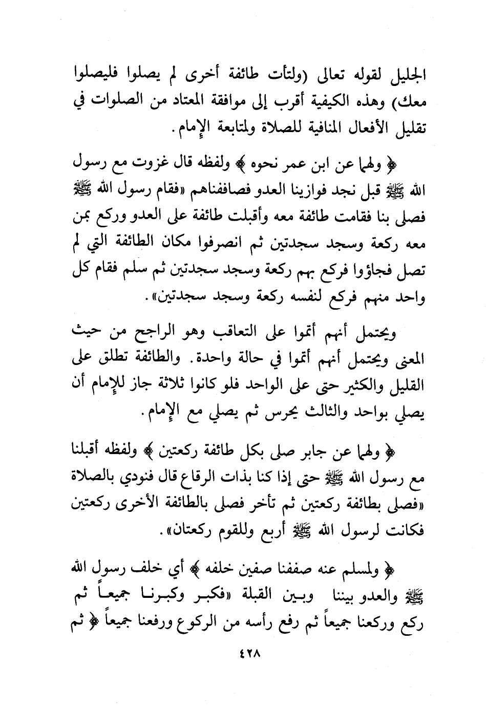 (ولهما عن جابر صلى بكل طائفة ركعتين) ولفظه أقبلنا مع رسول الله – - صلى الله عليه وسلم - حتى إذا كنا بذات الرقاع قال فنودي بالصلاة "فصلى بطائفة ركعتين ثم تأخر فصلى بالطائفة الأخرى ركعتين فكانت لرسول الله – - صلى الله عليه وسلم - أربع وللقوم ركعتان".