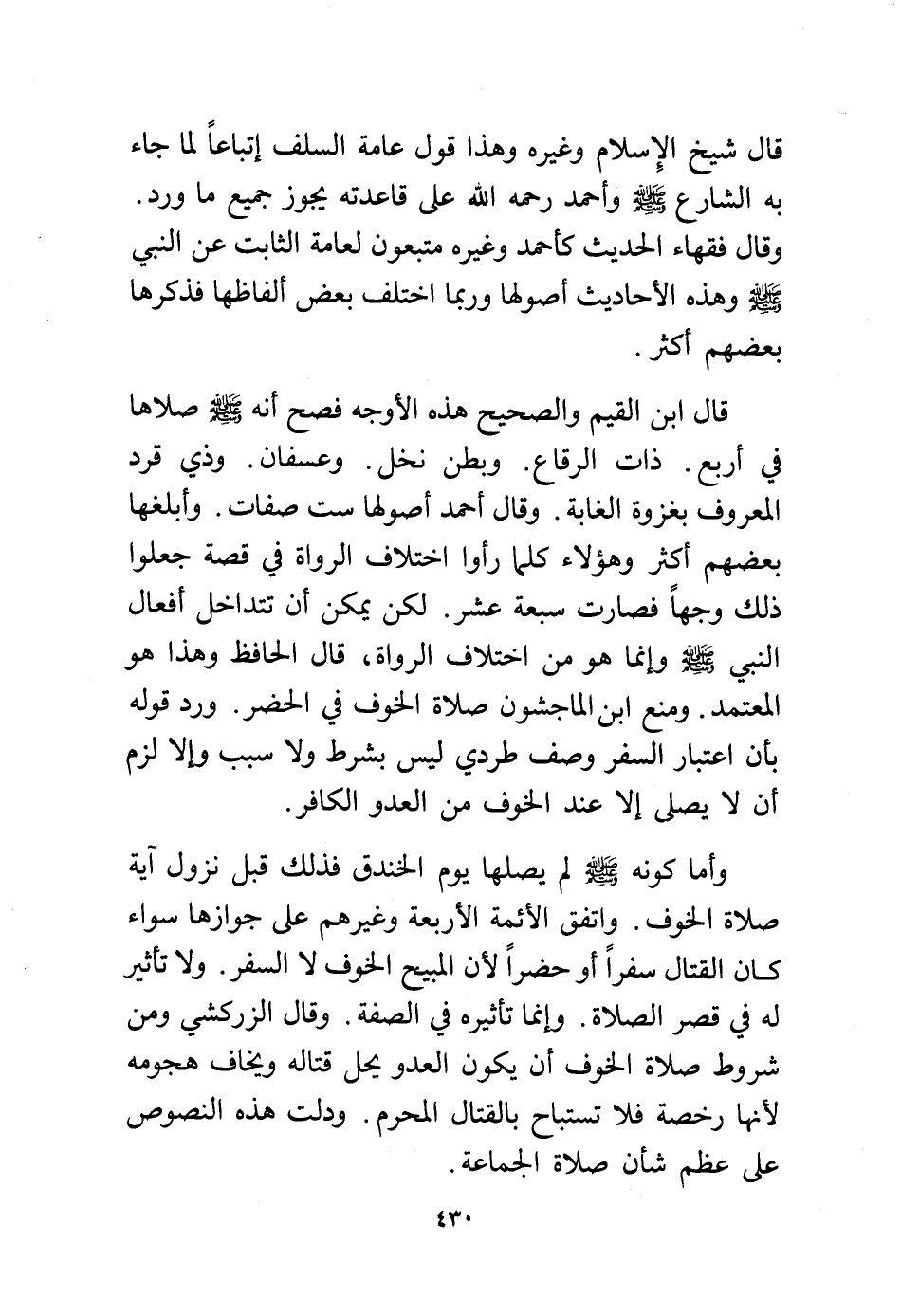 قال ابن القيم والصحيح هذه الأوجه فصح أنه – - صلى الله عليه وسلم - صلاها في أربع. ذات الرقاع وبطن نخل. وعسفان. وذي قرد المعروف بغزوة الغابة. وقال أحمد أصولها ست صفات: وأبلغها بعضهم أكثر هؤلاء كلما رأوا اختلاف الرواة في قصة جعلوا ذلك وجهًا فصارت سبعة عشر لكن يمكن أن تتداخل أفعال النبي – - صلى الله عليه وسلم - وإنما هو من اختلاف الرواة، قال الحافظ: وهذا هو المعتمد. ومنع ابن الماجشون صلاة الخوف في الحضر. ورد قوله بأن اعتبار السفر وصف طردي ليس بشرط ولا سبب وإلا لزم أن لا يصلي إلا عند الخوف من العدو الكافر.
