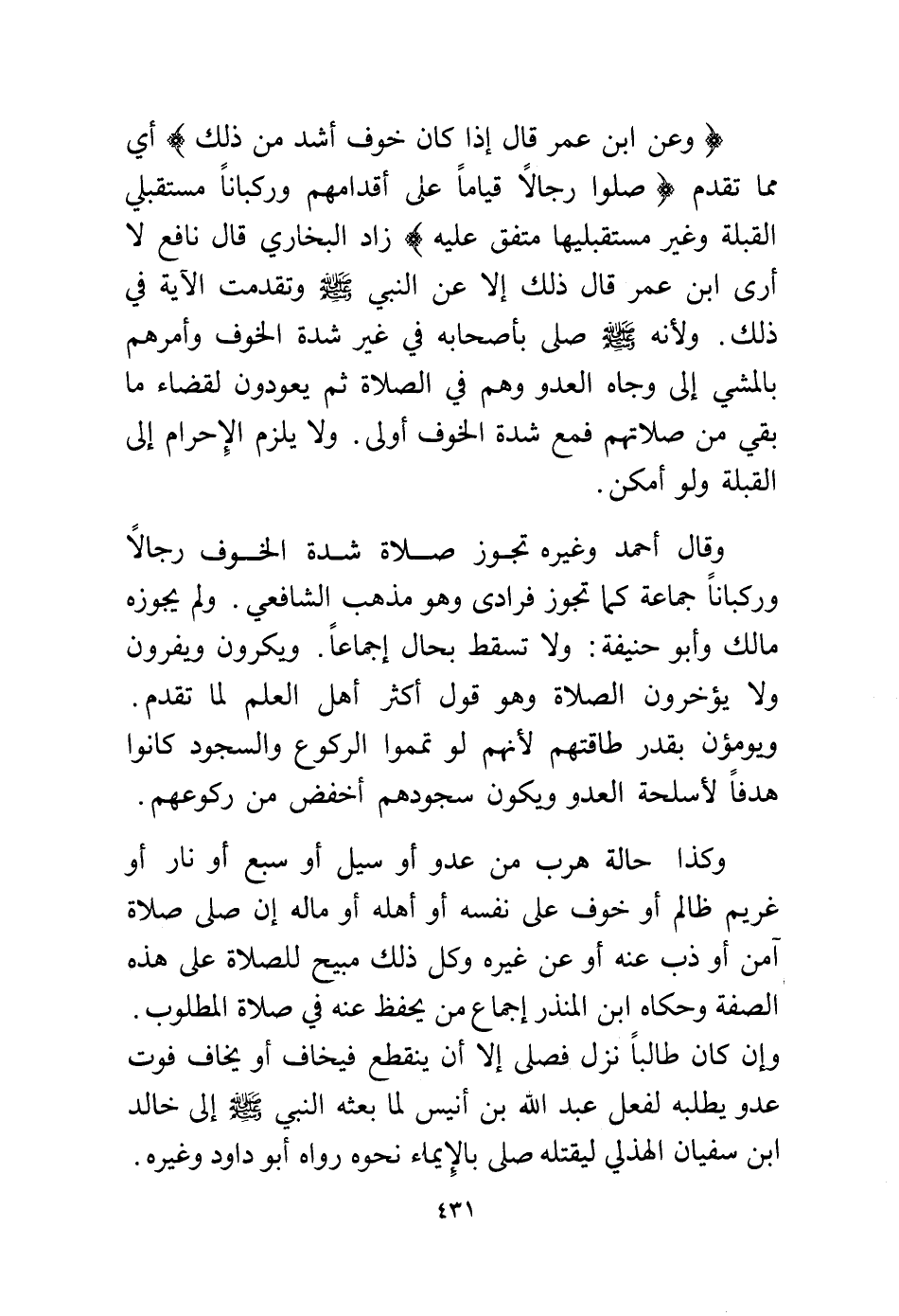(وعن ابن عمر قال إذا كان خوف أشد من ذلك) أي مما تقدم (صلوا رجالاً قيامًا على أقدامهم وركبانًا مستقبلي القبلة وغير مستقبليها متفق عليه) زاد البخاري قال نافع لا أرى ابن عمر قال ذلك إلا عن النبي – - صلى الله عليه وسلم - وتقدمت الآية في ذلك. ولأنه - صلى الله عليه وسلم - صلى بأصحابه في غير شدة الخوف وأمرهم بالمشي إلى وجاه العدو وهم في الصلاة ثم يعودون لقضاء ما بقي من صلاتهم فمع شدة الخوف أولى. ولا يلزم الإحرام على القبلة ولو أمكن.