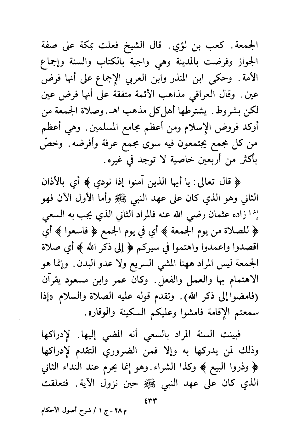 (قال تعالى: {يَا أَيُّهَا الَّذِينَ آمَنُوا إِذَا نُودِي} أي بالأذان الثاني وهو الذي كان على عهد النبي – - صلى الله عليه وسلم - وأما الأول الآن فهو إنما زاده عثمان رضي الله عنه فالمراد الثاني الذي يجب به السعي {لِلصَّلاَةِ مِن يَوْمِ الْجُمُعَةِ} أي في يوم الجمع {فَاسْعَوْا} أي اقصدوا واعمدوا واهتموا في سيركم {إِلَى ذِكْرِ اللَّهِ} أي صلاة الجمعة ليس المراد ههنا المشي السريع ولا عدو البدن. وإنما هو الاهتمام بها والعمل والفعل. وكان عمر وابن مسعود يقرآن (فامضوا إلى ذكر الله) وتقدم قوله عليه الصلاة والسلام "إذا سمعتم الإقامة فامشوا وعليكم السكينة والوقار".
