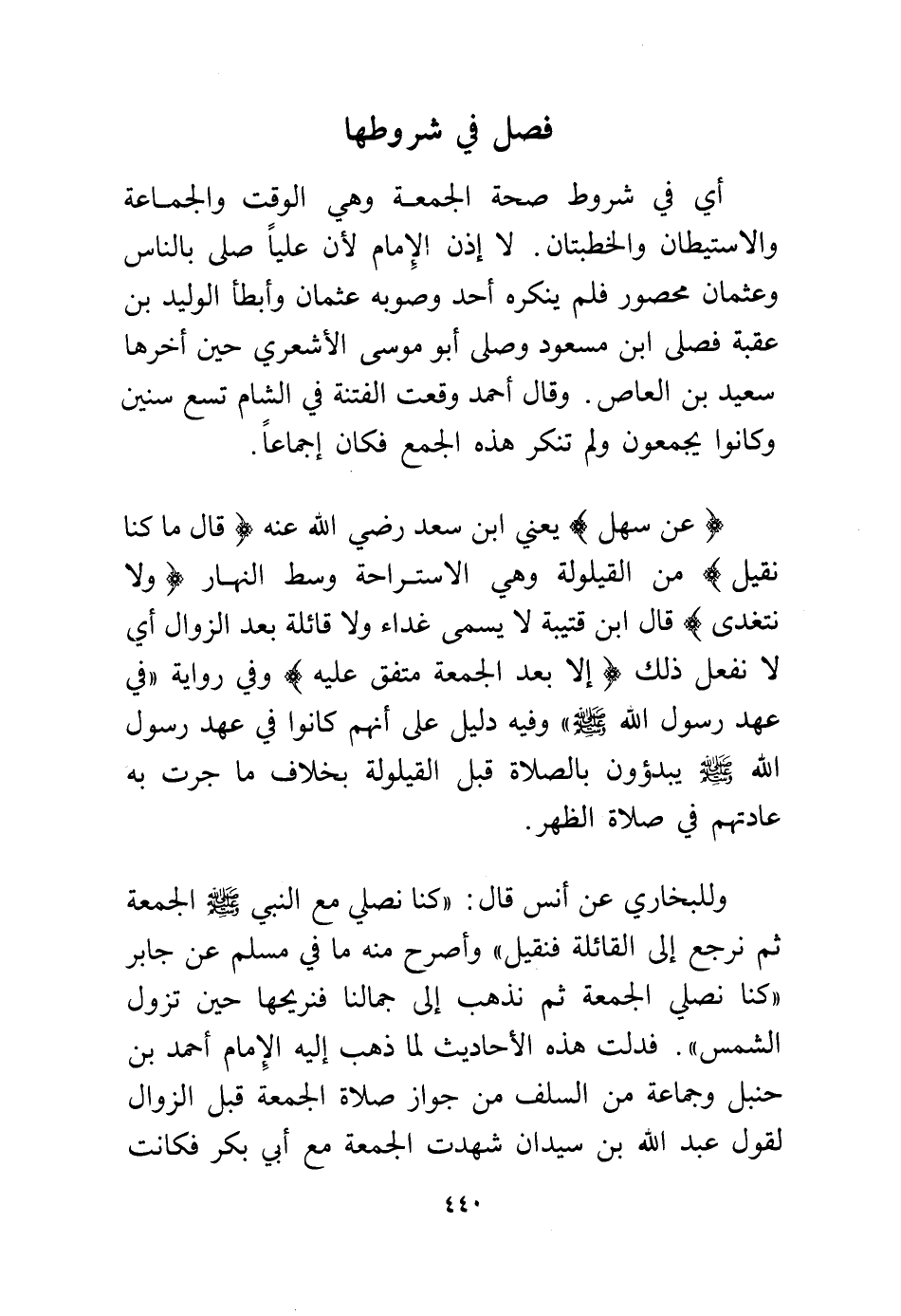 وللبخاري عن أنس قال: "كنا نصلي مع النبي - صلى الله عليه وسلم - الجمعة ثم نرجع إلى القائلة فنقبل" وأصرح منه ما في مسلم عن جابر "كنا نصلي الجمعة ثم نذهب إلى جمالنا فنربحها حين تزول الشمس". فدلت هذه الأحاديث لما ذهب إليه الإمام أحمد بن حنبل وجماعة من السلف من جواز صلاة الجمعة قبل الزوال لقول عبد الله بن سيدان شهدت الجمعة مع أبي بكر فكانت