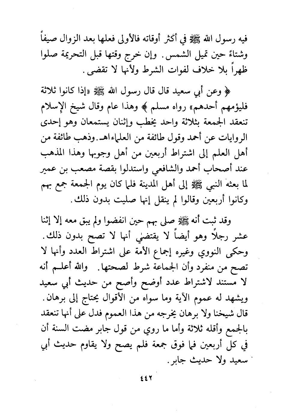وقد ثبت أنه – - صلى الله عليه وسلم - صلى بهم حين انفضوا ولم يبق معه إلا اثنا عشر رجلاً وهو أيضًا لا يقتضي أنها لا تصح بدون ذلك. وحكى النووي وغيره إجماع الأمة على اشتراط العدد وأنها لا تصح من منفرد وأن الجماعة شرط لصحتها. والله أعلم أنه لا مستند لاشتراط عدد أوضح وأصح من حديث أبي سعيد ويشهد له عموم الآية وما سواه من الأقوال يحتاج إلى برهان.
