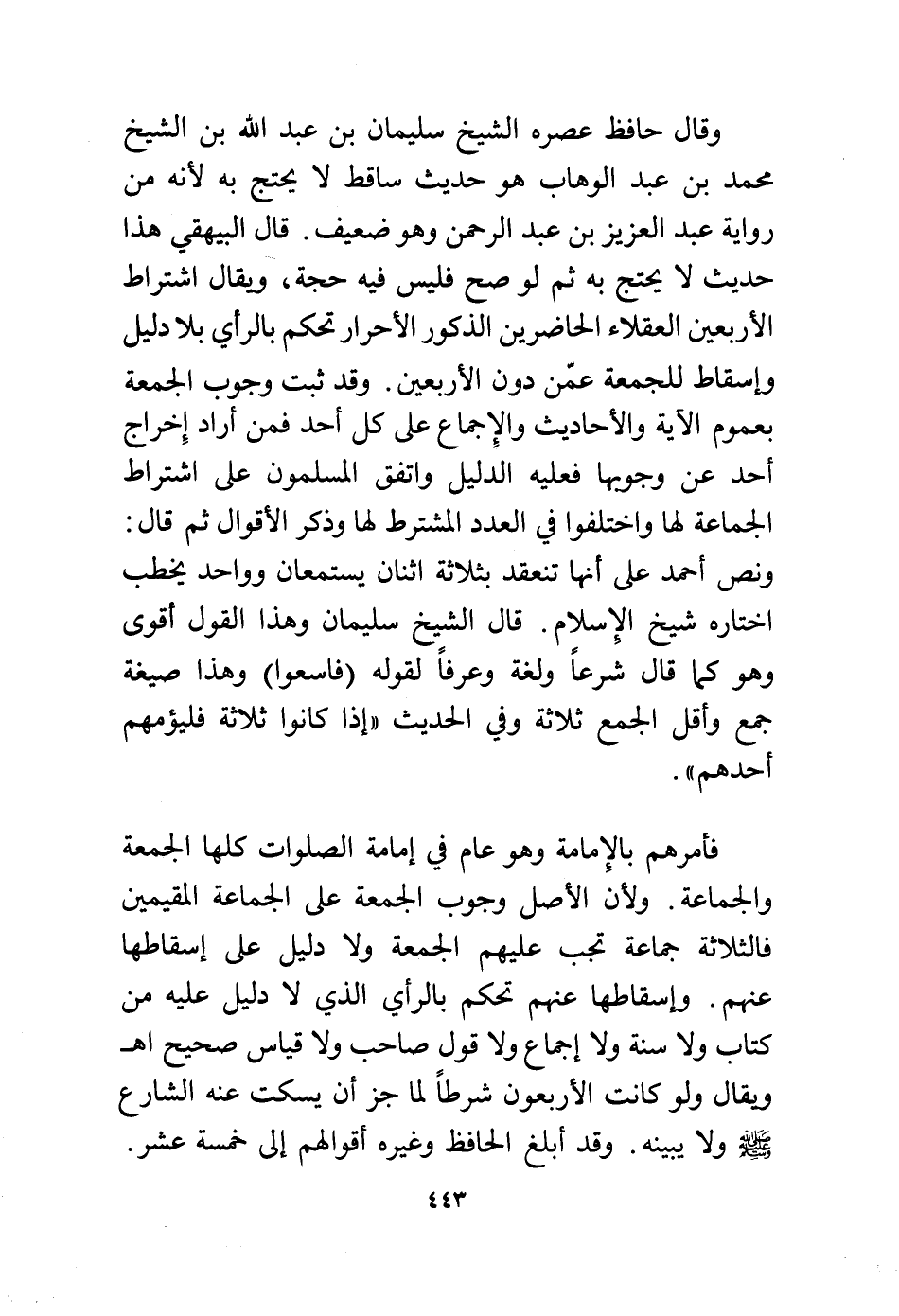 وقال حافظ عصره الشيخ سليمان بن عبد الله بن الشيخ محمد بن عبد الوهاب هو حديث ساقط لا يحتج به لأنه من رواية عبد العزيز بن عبد الرحمن وهو ضعيف. قال البيهقي هذا حديث لا يحتج به ثم لو صح فليس فيه حجة، ويقال اشتراط الأربعين العقلاء الحاضرين الذكور الأحرار تحكم بالرأي بلا دليل وإسقاط للجمعة عمن دون الأربعين. وقد ثبت وجوب الجمعة بعموم الآية والأحاديث والإجماع على كل أحد فمن أراد إخراج أحد عن وجوبها فعليه الدليل واتفق المسلمون على اشتراط الجماعة لها واختلفوا في العدد المشترط لها وذكر الأقوال ثم قال: ونص أحمد على أنها تنعقد بثلاثة اثنان يستمعان وواحد يخطب اختاره شيخ الإسلام. قال الشيخ سليمان وهذا القول أقوى وهو كما قال شرعًا ولغة وعرفًًا لقوله (فاسعوا) وهذا صيغة جمع وأقل الجمع ثلاثة وفي الحديث "إذا كانوا ثلاثة فليؤمهم أحدهم".