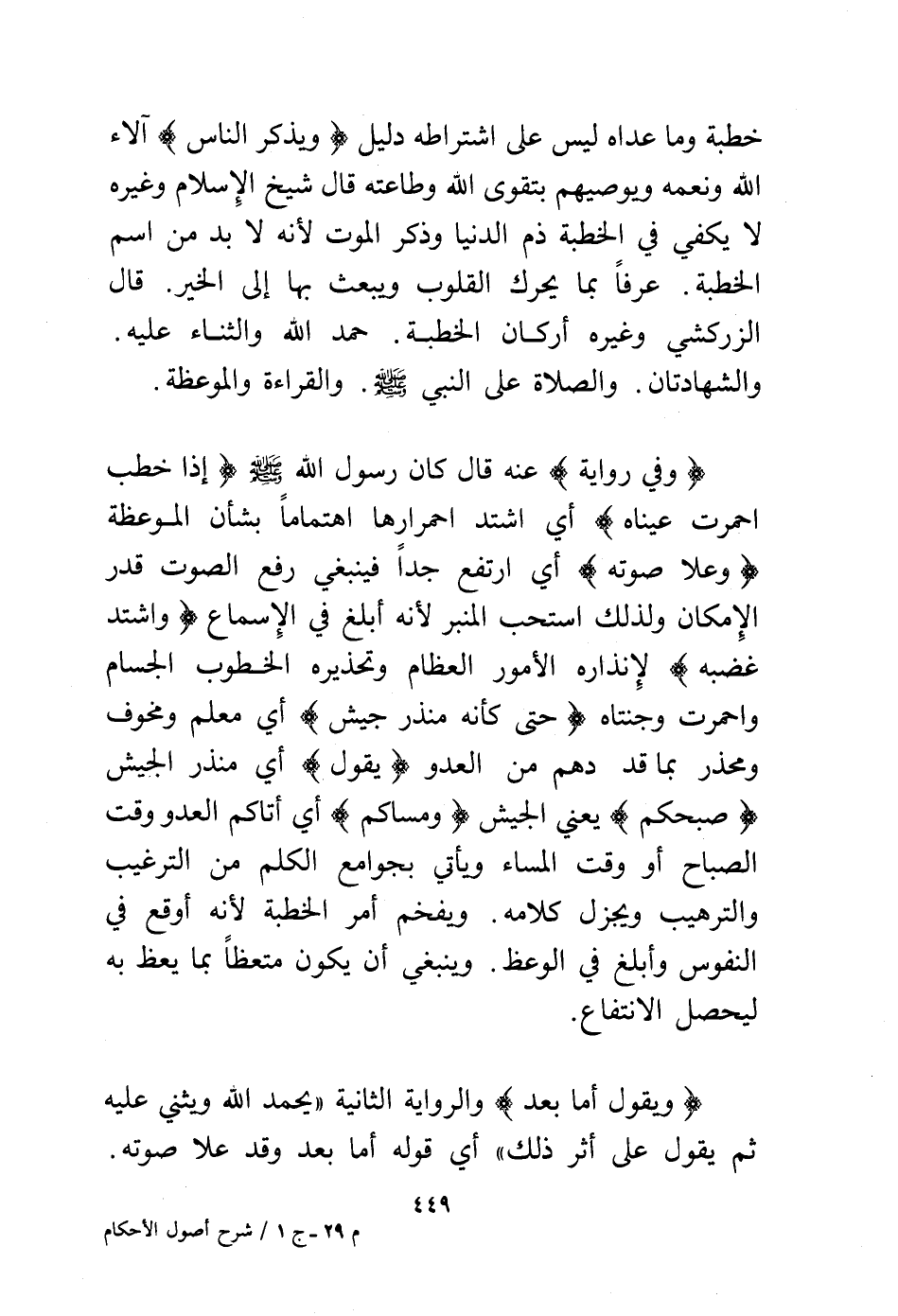خطبة وما عداه ليس على اشتراطه دليل (ويذكر الناس) آلاء الله ونعمه ويوصيهم بتقوى الله وطاعته قال شيخ الإسلام وغيره لا يكفي في الخطبة ذم الدنيا وذكر الموت لأنه لا بد من اسم الخطبة عرفًا بما يحرك القلوب ويبعث بها إلى الخير. قال الزركشي وغيره أركان الخطبة حمد الله والثناء عليه والشهادتان والصلاة على النبي – - صلى الله عليه وسلم - والقراءة والموعظة.