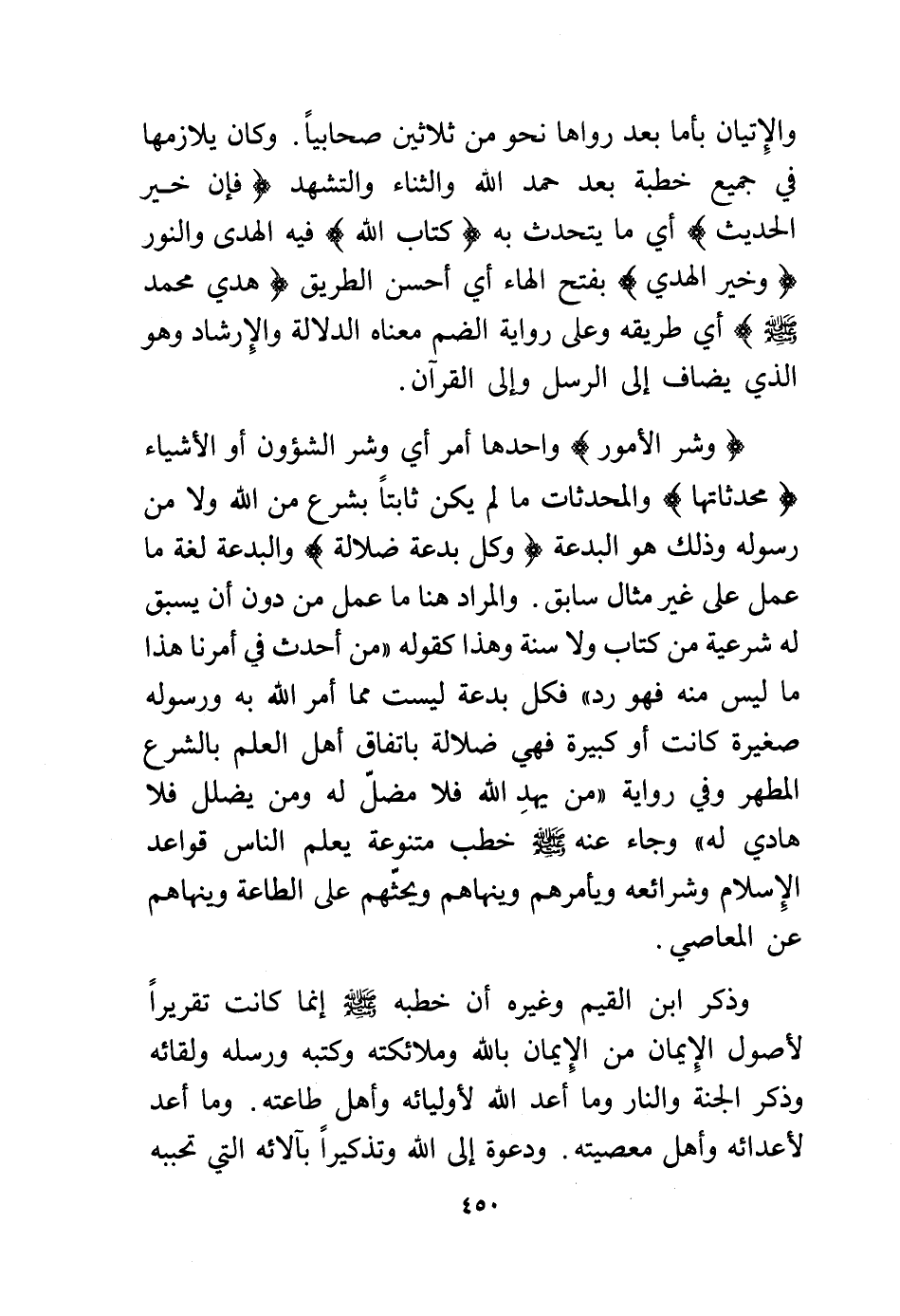 (وشر الأمور) واحدها أمر أي وشر الشؤون أو الأشياء (محدثاتها) والمحدثات ما لم يكن ثابتاً بشرع من الله ولا من رسوله وذلك هو البدعة (وكل بدعة ضلالة) والبدعة لغة ما عمل على غير مثال سابق والمراد هنا ما عمل من دون أن يسبق له شرعية من كتاب ولا سنة وهذا كقوله: "من أحدث في أمرنا هذا ما ليس منه فهو رد" فكل بدعة ليست مما أمر الله به ورسوله صغيرة كانت أو كبيرة فهي ضلالة باتفاق أهل العلم بالشرع المطهر وفي رواية "من يهد الله فلا مضل له ومن يضلل فلا هادي له"، وجاء عنه - صلى الله عليه وسلم - خطب متنوعة يعلم الناس قواعد الإسلام وشرائعة ويأمرهم وينهاهم ويحثهم على الطاعة وينهاهم عن المعاصي.