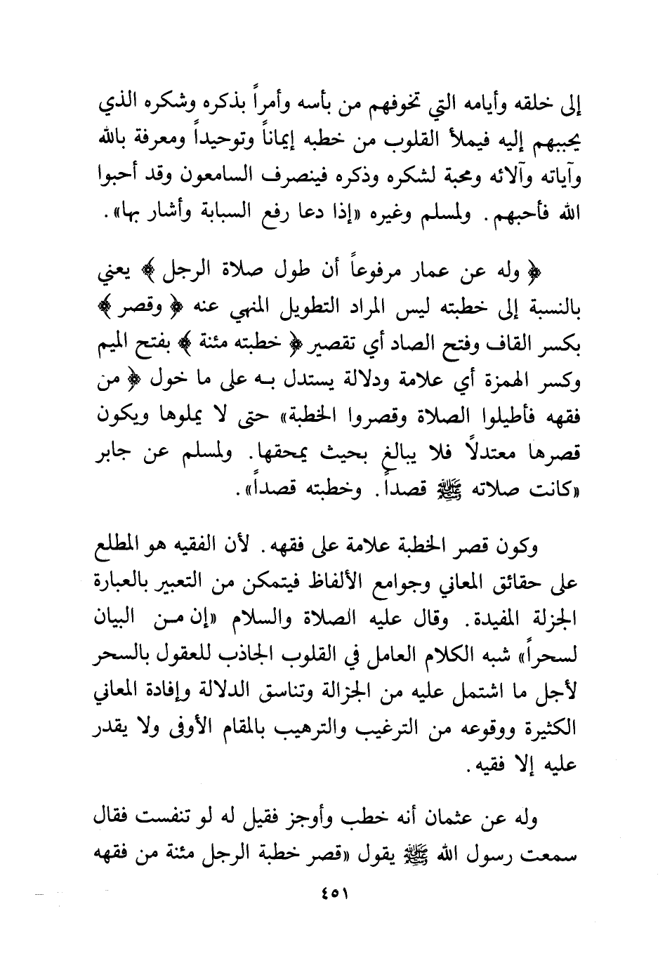 وكون قصر الخطبة علامة على فقهه. لأن الفقيه هو المطلع على حقائق المعاني وجوامع الألفاظ فيتمكن من التعبير بالعبارة الجزلة المفيدة. وقال عليه الصلاة والسلام "إن من البيان لسحرًا"شبه الكلام العامل في القلوب الجاذب للعقول بالسحر لأجل ما اشتمل عليه من الجزالة وتناسق الدلالة وإفادة المعاني الكثيرة ووقوعه من الترغيب والترهيب بالمقام الأوفى ولا يقدر عليه إلا فقيه.