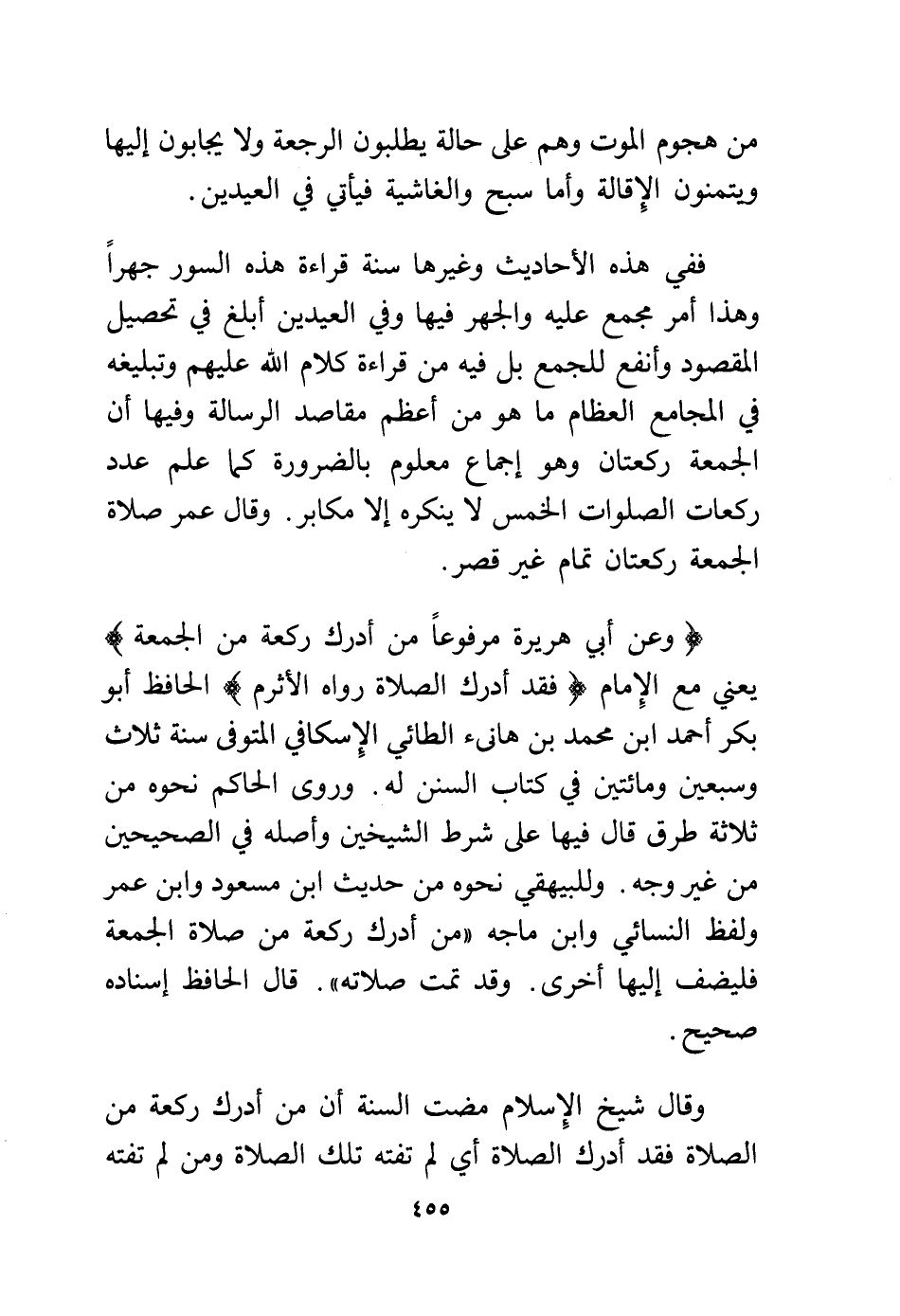 ففي هذه الأحاديث وغيرها سنة قراءة هذه السور جهرًا وهذا أمر مجمع عليه والجهر فيها وفي العيدين أبلغ في تحصيل المقصود وأنفع للجمع بل فيه من قراءة كلام الله عليهم وتبليغه في المجامع العظام ما هو من أعظم مقاصد الرسالة وفيها أن الجمعة ركعتان وهو إجماع معلوم بالضرورة كما علم عدد ركعات الصلوات الخمس لا ينكره إلا مكابر. وقال عمر صلاة الجمعة ركعتان تمام غير قصر.