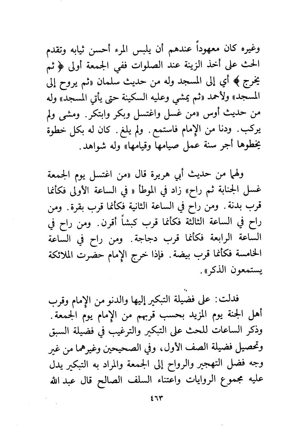فدلت: على فضيلة التبكير إليها والدنو من الإمام وقرب أهل الجنة يوم المزيد بحسب قربهم من الإمام يوم الجمعة. وذكر الساعات للحث على التبكير والترغيب في فضيلة السبق وتحصيل فضيلة الصف الأول، وفي الصحيحين وغيرهما من غير وجه فضل التهجير والرواح إلى الجمعة والمراد به التبكير