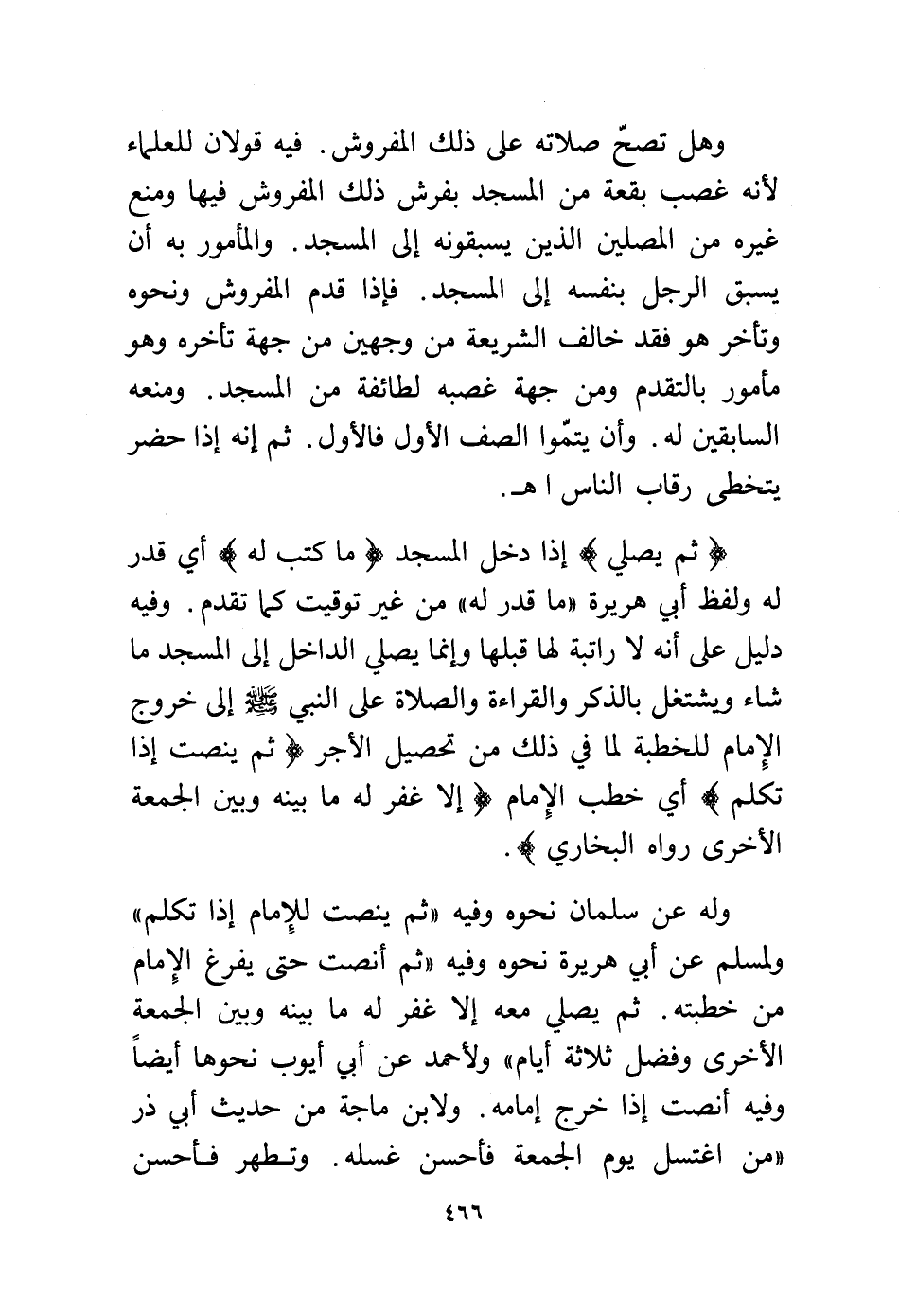 وهل تصح صلاته على ذلك المفروش. فيه قولان للعلماء لأنه غصب بقعة من المسجد بفرش ذلك المفروش فيها ومنع غيره من المصلين الذين يسبقونه إلى المسجد. والمأمور به أن يسبق الرجل بنفسه إلى المسجد. فإذا قدم المفروش ونحوه وتأخر هو فقد خالف الشريعة من وجهين من جهة تأخره وهو مأمور بالتقدم ومن جهة غصبه لطائفة من المسجد. ومنعه السابقين له وأن يتموا الصف الأول فالأول. ثم إنه إذا حضر يتخطى رقاب الناس أهـ.