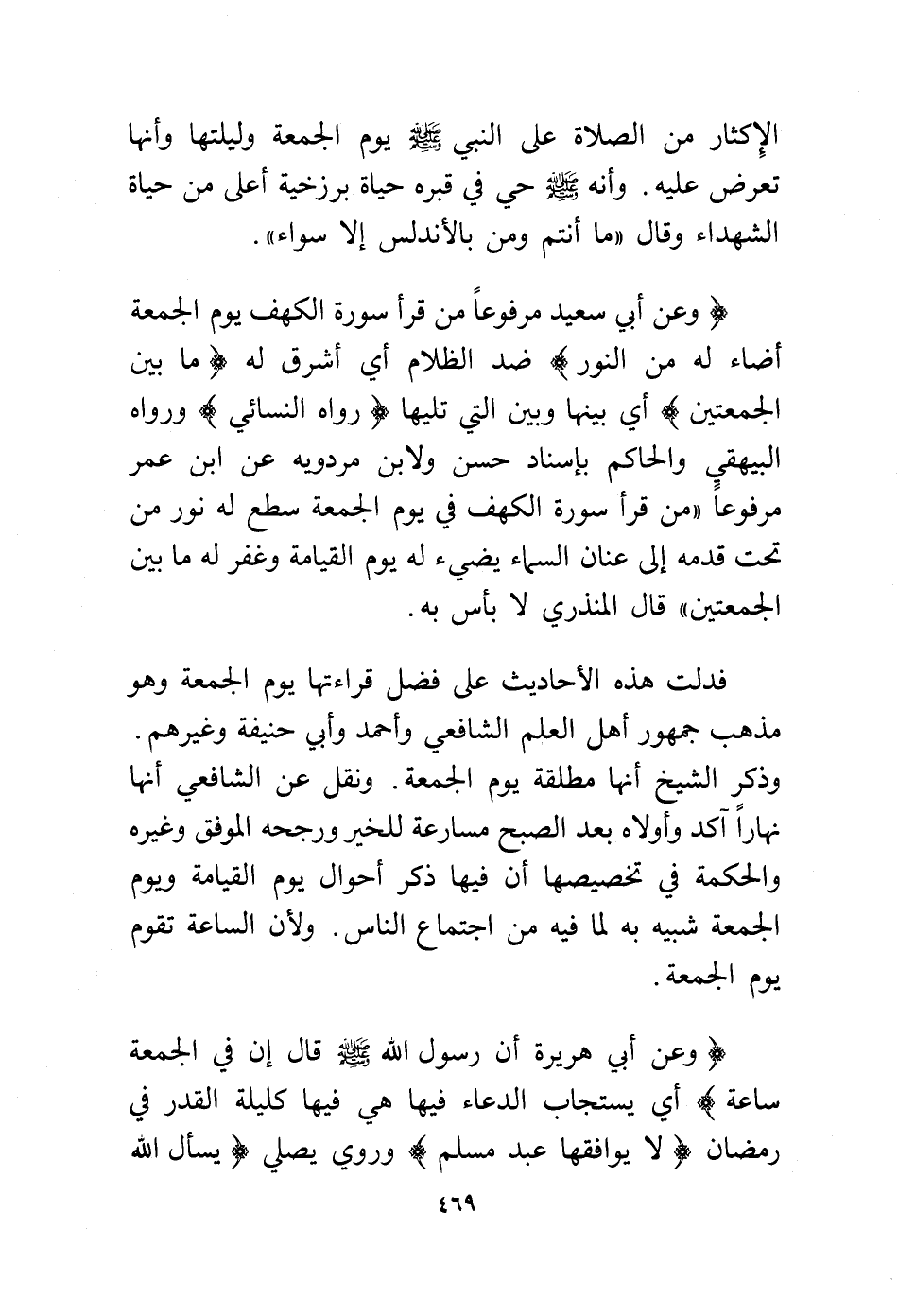 الإكثار من الصلاة على النبي - صلى الله عليه وسلم - يوم الجمعة وليلتها وأنها تعرض عليه وأنه - صلى الله عليه وسلم - حي في قبره حياة برزخية أعلى من حياة الشهداء وقال "ما أنتم ومن بالأندلس إلا سواء".