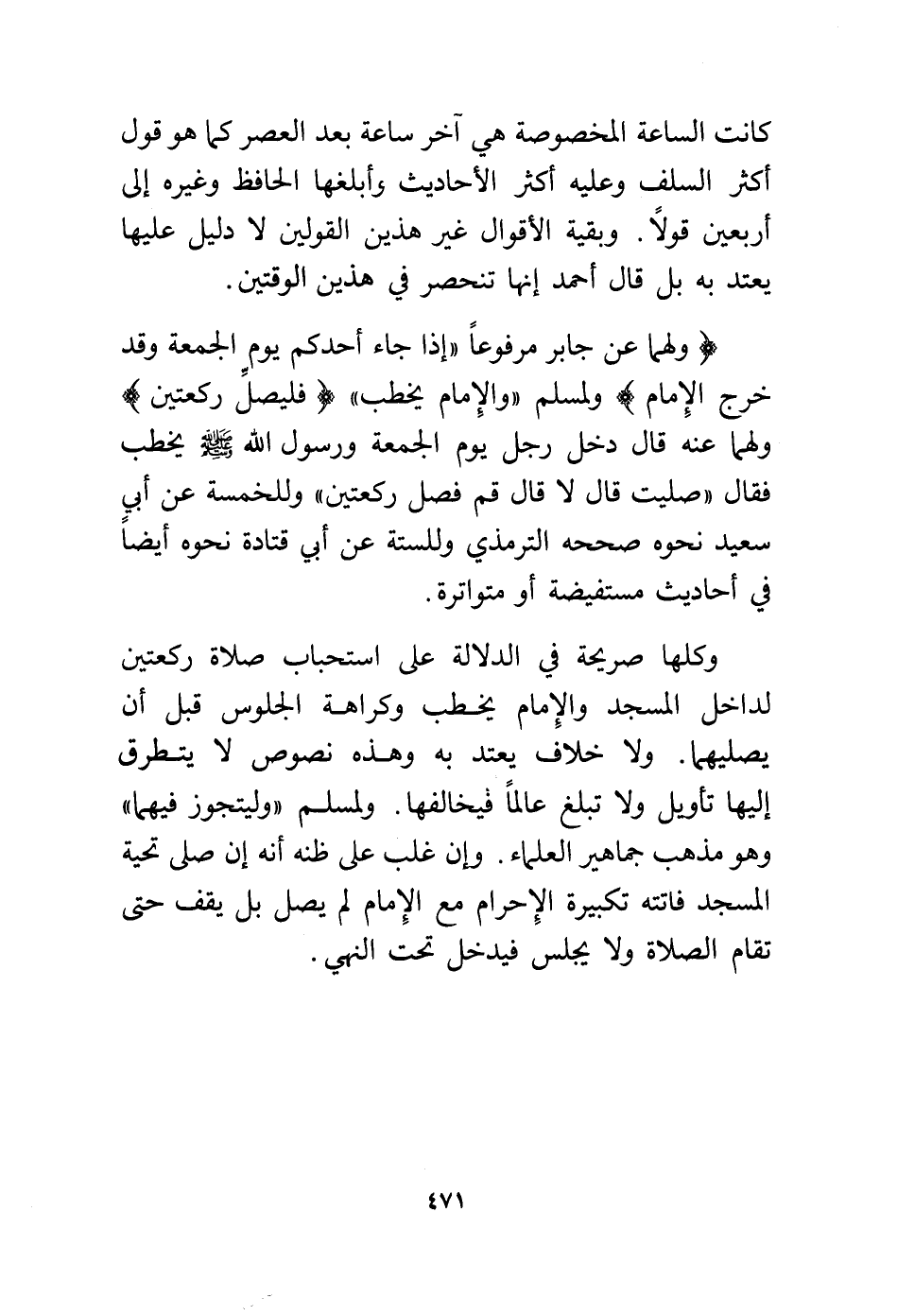 وإن كانت الساعة المخصوصة هي آخر ساعة بعد العصر كما هو قول أكثر السلف وعليه أكثر الأحاديث وأبلغها الحافظ وغيره إلى أربعين قولاً وبقية الأقوال غير هذين القولين لا دليل عليها يعتد به بل قال أحمد إنها تنحصر في هذين الوقتين.