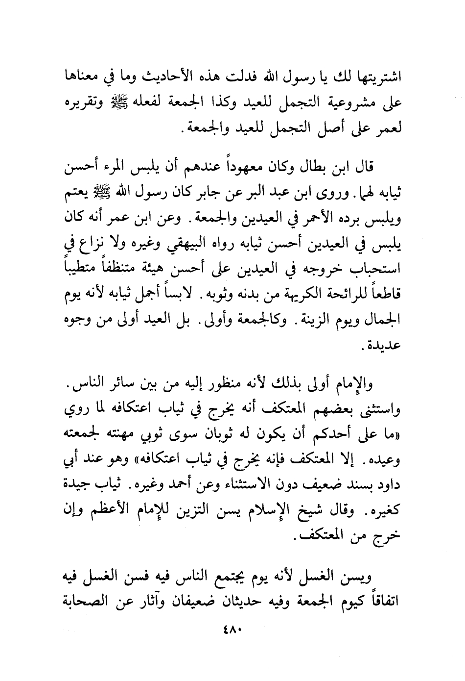 والإمام أولى بذلك لأنه منظور إليه من بين سائر الناس. واستثنى بعضهم المعتكف أنه يخرج في ثياب اعتكافه لما روي "ما على أحدكم أن يكون له ثوبان سوى ثوبي مهنته لجمعته وعيده. إلا المعتكف فإنه يخرج في ثياب اعتكافه" وهو عند أبي داود بسند ضعيف دون الاستثناء وعن أحمد وغيره. ثياب جيدة كغيره. وقال شيخ الإسلام يسن التزين للإمام الأعظم وإن خرج من المعتكف.