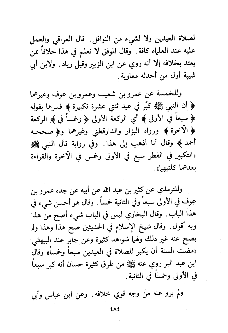 وللخمسة عن عمرو بن شعيب وعمرو بن عوف وغيرهما (أن النبي - صلى الله عليه وسلم - كبر في عيد ثنتي عشرة تكبيرة) فسرها بقوله (سبعًا في الأولى) أي الركعة الأولى (وخمسًا في) الركعة الأخرى ورواه البزار والدارقطني وغيرهما و (صححه أحمد) وقال أنا أذهب إلى هذا. وفي رواية قال النبي - صلى الله عليه وسلم - "التكبير في الفطر سبع في الأولى وخمس في الآخرة والقراءة بعدهما كلتيهما".