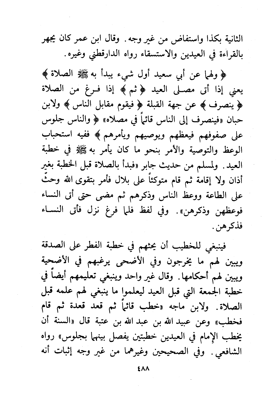 فينبغي للخطيب أن يحثهم في خطبة الفطر على الصدقة ويبين لهم ما يخرجون وفي الأضحى يرغبهم في الأضحية ويبين لهم أحكامها. وقال غير واحد وينبغي تعليمهم أيضًا في خطبة الجمعة التي قبل العيد ليعلموا ما ينبغي لهم عمله قبل الصلاة. ولابن ماجه "خطب قائمًا ثم قعد قعدة ثم قام فخطب"
