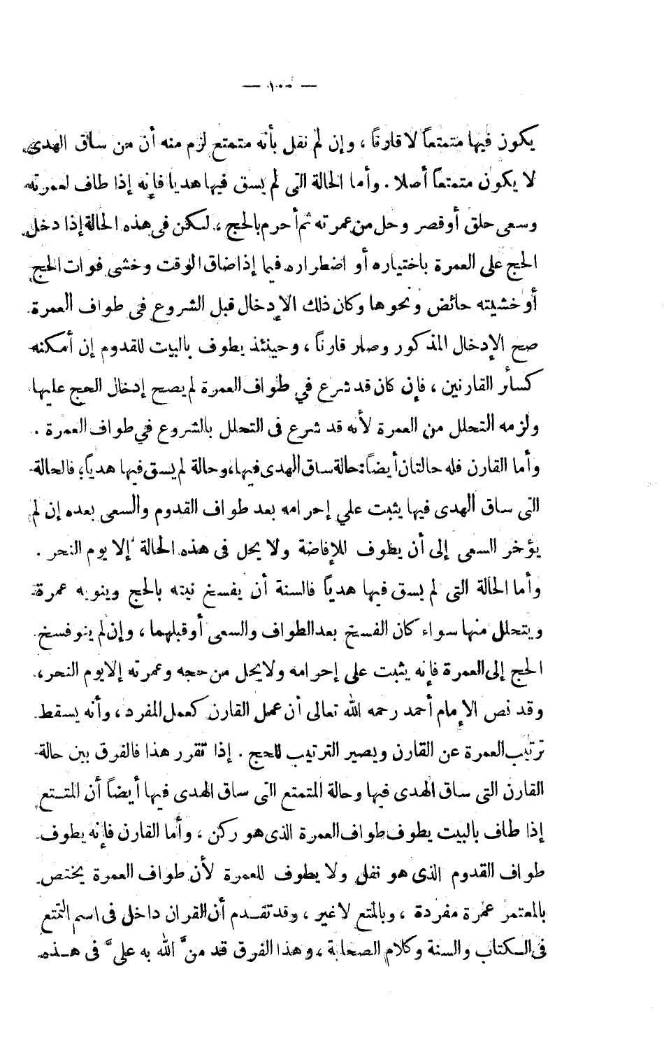 وأما الحالة التي لم يسق فيها هديا فإنه إذا طاف لعمرته وسعى حلق أو قصر وحل من عمرته ثم أحرم بالحج، لكن في هذه الحالة إذا أدخل الحج على العمرة باختياره أو اضطراره فيما إذا ضاق الوقت وخشي فوات الحج أو خشيته حائض ونحوها وكان ذلك الإدخال قبل الشروع في طواف العمرة، صح الإدخال المذكور وصار قارناً، وحينئذ يطوف بالبيت للقدوم إن أمكنه كسائر القارنين، فإن كان قد شرع في طواف العمرة لم يصح إدخال الحج عليها ولزمه التحلل من العمرة لأنه قد شرع في التحلل بالشروع في طواف العمرة. وأما القارن فله حالتان أيضاً: حالة ساق الهدي فيها، وحالة لم يسق فيها هدياً، فالحالة التي ساق الهدي فيها يثبت على إحرامه بعد طواف القدوم والسعي بعده إن لم يؤخر السعي إلى أن يطوف للإفاضة ولا يحل في هذه الحالة إلا يوم النحر.