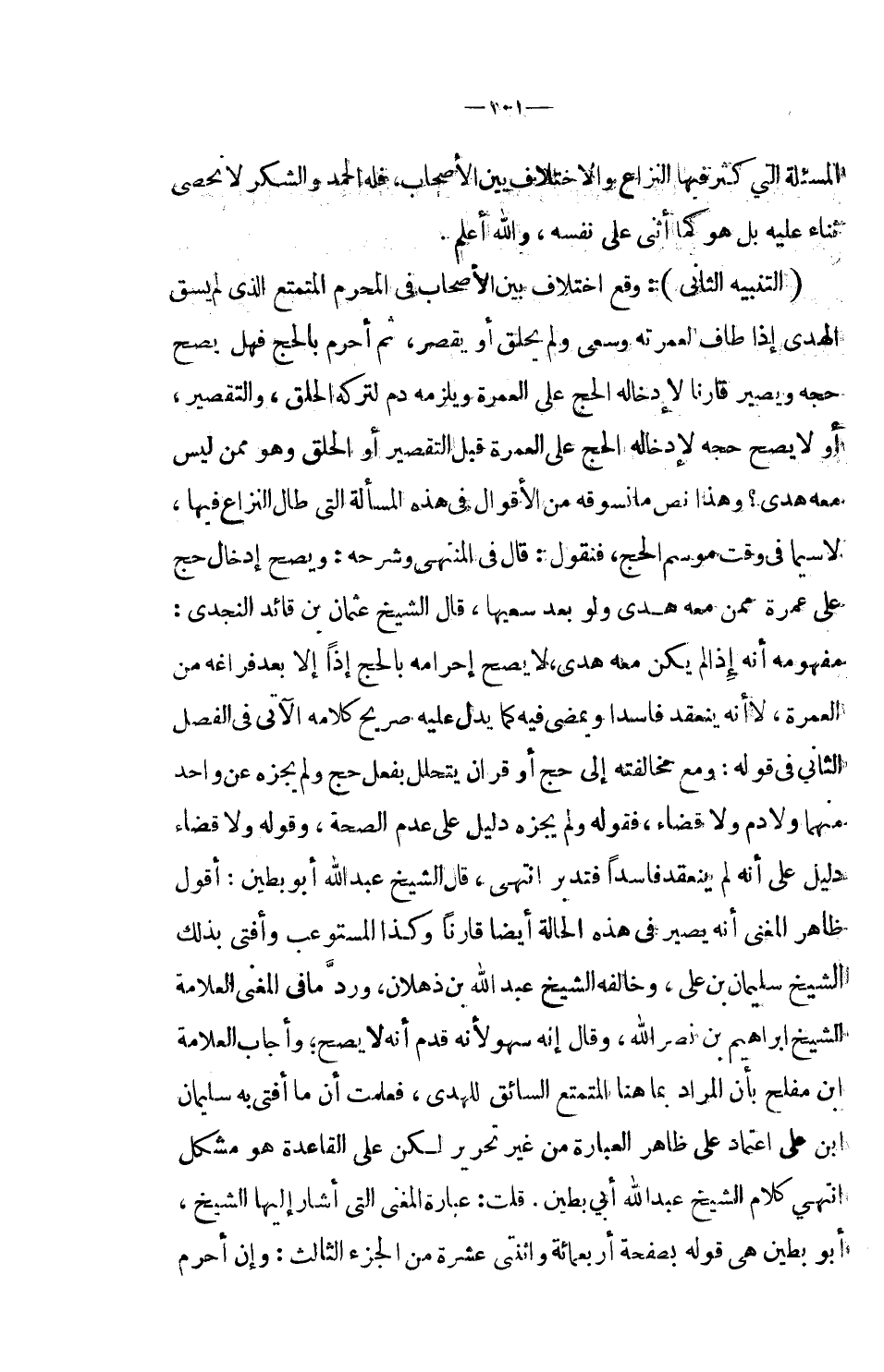 (التنبيه الثاني) : وقع اختلاف بين الأصحاب في المحرم المتمتع الذي لم يسق الهدي إذا طاف لعمرته وسعى ولم يحلق أو يقصر، ثم أحرم بالحج فهل يصح حجه ويصير قارنا لإدخاله الحج على العمرة ويلزمه دم لتركه الحلق، والتقصير، أو لا يصح حجه لإدخاله الحج على العمرة قبل التقصير أو الحلق وهو ممن ليس معه هدي؟ وهذا نص ما نسوقه من الأقوال في هذه المسألة التي طال النزاع فيها، لا سيما في وقت موسم الحج، فنقول: قال في المنتهى وشرحه: ويصح إدخال حج على عمرة ممن معه هدي ولو بعد سعيها، قال الشيخ عثمان بن قائد النجدي: مفهومه أنه إذا لم يكن معه هدي، لا يصح إحرامه بالحج إذاً إلا بعد فراغه من العمرة، لا أنه ينعقد فاسداً ويمضي فيه كما يدل عليه صريح كالمه الآتي في الفصل الثاني في قوله: ومع مخالفته إلى حج أو قران يتحلل بفعل حج ولم يجزه عن واحد منهما ولا دم ولا قضاء، فقوله ولم يجزه دليل على عدم الصحة، وقوله ولا قضاء دليل على أنه لم ينعقد فاسداً فتدبر انتهى، قال الشيخ عبد الله أبو بطين: أقول ظاهر المغني أنه يصير في هذه الحالة أيضاً قارنا وكذا المستوعب وأفتى بذلك الشيخ سليمان بن علي، وخالفه الشيخ عبد الله بن ذهلان، ورد ما في المغني العلامة الشيخ إبراهيم بن نصر الله، وقال إنه سهو لأنه قدم أنه لا يصح، وأجاب العلامة ابن مفلح بأن المراد بما هنا المتمتع السائق للهدي، فعلمت أن ما أفتى به سليمان بن علي اعتماد على ظاهر العبارة من غير تحرير لكن على القاعدة هو مشكل انتهى كلام الشيخ عبد الله أبي بطين.