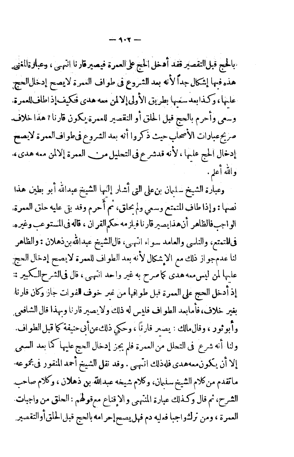 وعبارة الشيخ سليما بن علي التي أشار إليها الشيخ عبد الله أبو بطين هذا نصها: وإذا طاف المتمتع وسعي ولم يحلق، ثم أحرم وقد بقي عليه حلق العمرة الواجب فالظاهر أن هذا يصير قارنا فيلزمه حكم القران، قاله في المستوعب وغيره في المتمتع، والناسي والعامد سواء انتهى، قال الشيخ عبد الله بن ذهلان: والظاهر لنا جواز ذلك مع الإشكال لأنه بعد الطواف للعمرة لا يصح إدخال الحج عليها لمن ليس معه هدي كما صرح به غير واحد انتهى، قال في الشرح الكبير: إذا أدخل الحج على العمرة قبل طوافها من غير خوف لفوات جاز وكان قارنا بغير خلاف، فأما بعد الطواف فليس له ذلك ولا يصير قارنا وبهذا قال الشافعي وأبو ثور، وقال مالك: يصير قارنا، وحكى ذلك عن أبي حنيفة كما قبل الطواف. ولنا أنه شرع في التحلل من العمرة فلم يجز إدخال الحج عليها كما بعد السعي، إلا أن يكون معهد هدي فله ذلك انتهى. وقد نقل الشيخ أحمد المنقور في مجموعة ما تقدم من كلام الشيخ سليمان، وكلام شيخه عبد الله بن ذهلان، وكلام صاحب الشرح، ثم قال وكذلك عبارة المنتهى، والإقناع مع قولهم: الحلق من واجبات العمرة، ومن ترك واجباً فعليه دم فهل يصح إحرامه بالحج قبل الحلق أو التقصير،