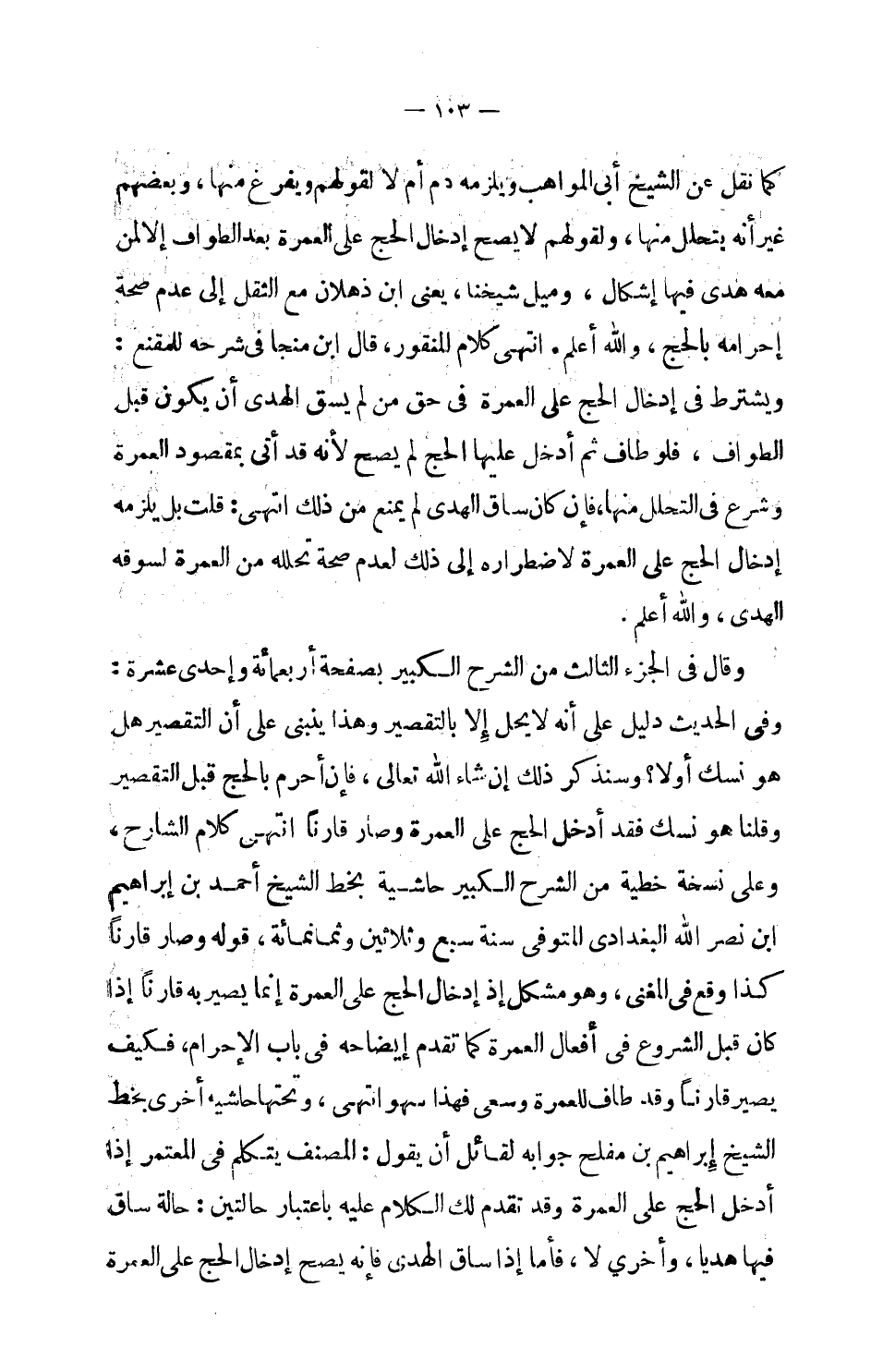 وقال في الجزء الثالث من الشرح الكبير بصفحة أربعمائة وإحدى عشرة: وفي الحديث دليل على أنه لا يحل إلا بالتقصير وهذا ينبني على أن التقصير هل هو نسك أو لا؟ وسنذكر ذلك إن شاء الله تعالى: فإن أحرم بالحج قبل التقصير وقلنا هو نسك فقد أدخل الحج على العمرة وصار قارنا انتهى كلام الشارح، وعلى نسخة خطية من الشرح الكبير حاشية بخط الشيخ احمد بن إبراهيم بن نصر الله البغدادي المتوفى سنة سبع وثلاثين وثمانمائة، قوله وصار قارناً كذا وقع في المغني، وهو مشكل إذ إدخال الحج على العمرة إنما يصير به قارناً إذا كان قبل الشروع في أفعال العمرة كما تقدم إيضاحه في باب الإحرام، فكيف يصير قارناً وقد طاف للعمرة وسعى فهذا سهو انتهى. وتحتها حاشية أخرى بخط الشيخ إبراهيم بن مفلح جوابه لقائل أن يقول: المصنف يتكلم في المعتمر إذا أدخل الحج على العمرة وقد تقدم لك الكلام عليه باعتبار حالتين: حالة ساق فيها هدياً، وأخرى لا، فأما إذا ساق الهدي فإنه يصح إدخال الحج على العمرة