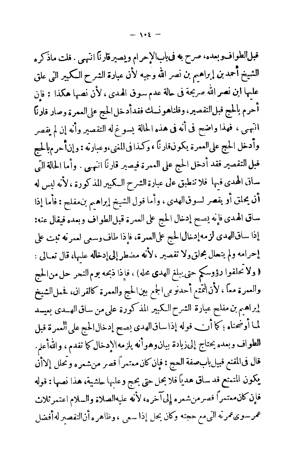 وأما الحالة التي ساق الهدي فيها فلا تنطبق على عبارة الشرح الكبير المذكورة، لأنه ليس له أن يحلق أو يقصر لسوق الهدي، وأما قول الشيخ إبراهيم بن مفلح: فأما إذا ساق الهدي فإنه يصح إدخال الحج على العمرة قبل الطواف وبعده فيقال عنه: إذا ساق الهدي لزمه إدخاله الحج على العمرة، فإذا طاف وسعى لعمرته ثبت على إحرامه ولم يتحلل بحلق ولا تقصير، لأنه مضطر إلى إدخاله عليها، قال تعالى: (ولا تحلقوا رءوسكم حتى يبلغ الهدي محله) ، فإذا ذبحه يوم النحر حل من الحج والعمرة معاً، لأن التمتع أحد نوعي الجمع بين الحج والعمرة كالقران، فحمل الشيخ إبراهيم بن مفلح عبارة الشرح الكبير المذكورة على من ساق الهدي بعيد لما أوضحناه؛ كما أن قوله إذا ساق الهدي يصح إدخال الحج على العمرة قبل الطواف وبعده يحتاج إلى زيادة بيان وهو أنه يلزمه الإدخال كما تقدم، والله أعلم.
