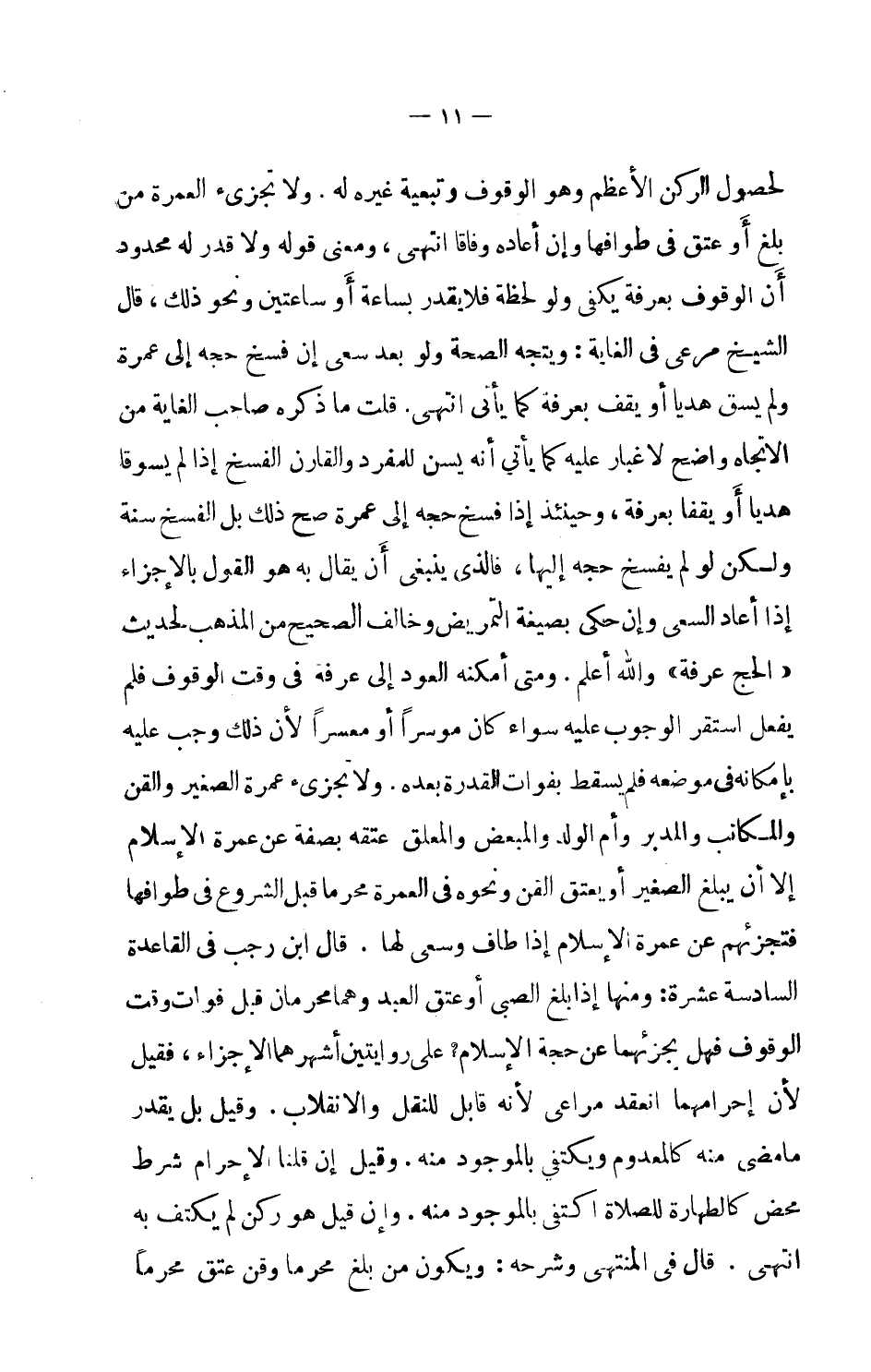 ومتى أمكنه العود إلى عرفة في وقت الوقوف فلم يفعل استقر الوجوب عليه سواء كان مؤسراً أو معسراً، لأن ذلك وجب عليه بإمكانه في موضعه فلم يسقط بفوات القدرة بعده. ولا تجزئ عمرة الصغير والقن والمكاتب والمدبر وأم الولد والمبعض والمعلق عتقه بصفة عن عمرة الإسلام إلا أن يبلغ الصغير أو يعتق القن ونحوه في العمرة محرماً قبل الشروع في طوافها فتجزئهم عن عمرة الإسلام إذا طاف وسعى لها.