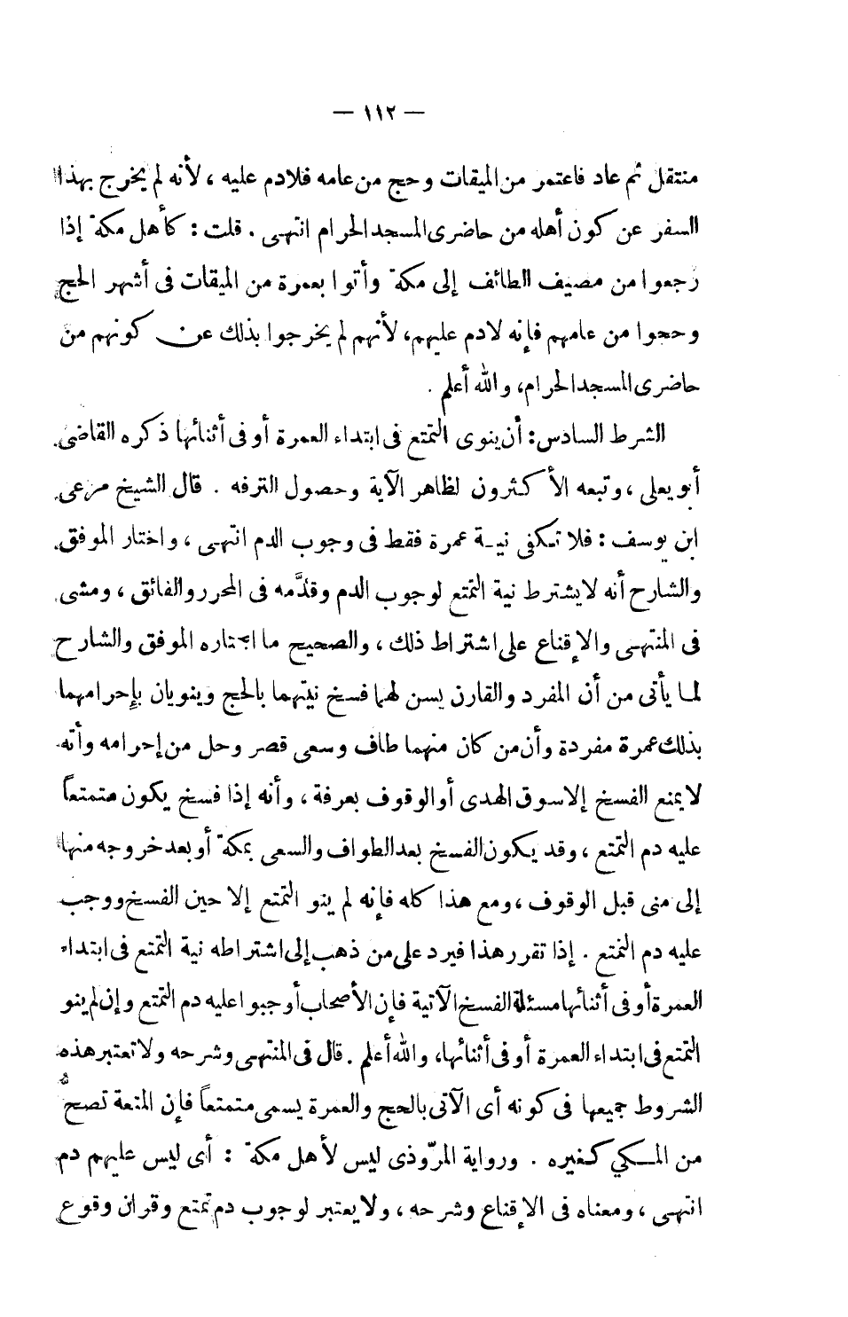 الشرط السادس: أن ينوي التمتع في ابتداء العمرة أو في أثنائها ذكره القاضي أبو يعلى، وتبعه الأكثرون لظاهر الآية وحصول الترفه.