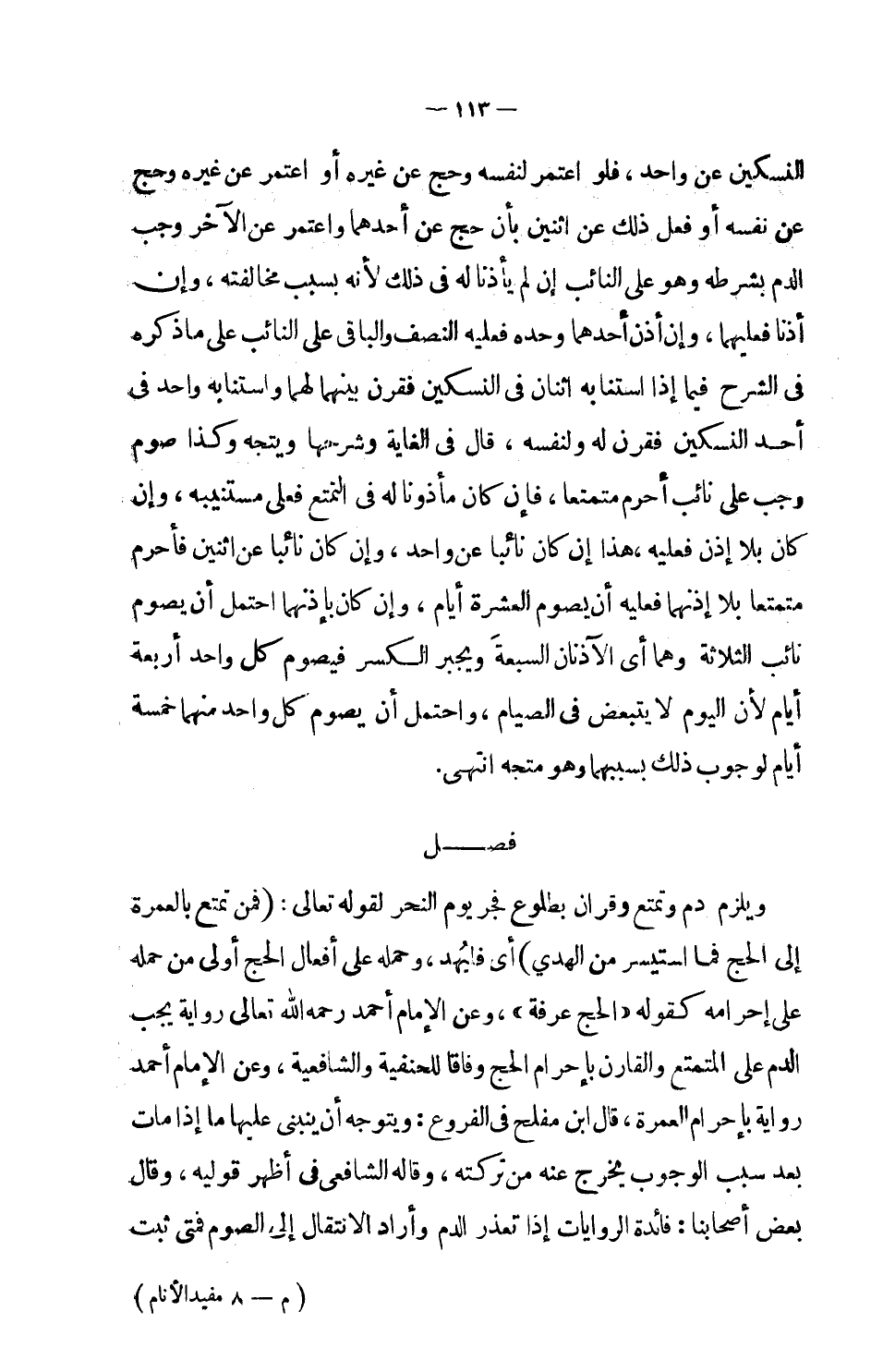 النسكين عن واحد، فلو اعتمر لنفسه وحج عن غيره أو اعتمر عن غيره وحج عن نفسه أو فعل ذلك عن اثنين بأن حج عن أحدهما واعتمر عن الآخر، وجب الدم بشرطه وهو على النائب إن لم يأذنا له في ذلك لأنه بسبب مخالفته، وإن أذنا فعليهما، وإن أذن أحدهما وحده فعليه النصف والباقي على النائب على ما ذكره في الشرح فيما إذا استنابه اثنان في النسكين فقرن بينهما لهما واستنابه واحد في أحد النسكين فقرن له ولنفسه، قال في الغاية وشرحها ويتجه، وكذا صوم وجب على نائب أحرم متمتعاً، فإن كان مأذونا له في التمتع فعلى مستنيبه، وإن كان بلا إذن فعليه، هذا إن كان نائباً عن واحد، وإن كان نائباً عن اثنين فأحرم متمتعاً بلا إذنهما فعليه أن يصوم العشرة أيام، وإن كان بإذنهما احتمل أن يصوم نائب الثلاثة وهما أي الآذنان السبعة، ويجبر الكسر فيصوم كل واحد أربعة أيام، لأن اليوم لا يتبعض في الصيام، واحتمل أن يصوم كل واحد منهما خمسة أيام لوجوب ذلك بسببهما وهو متجه انتهى.