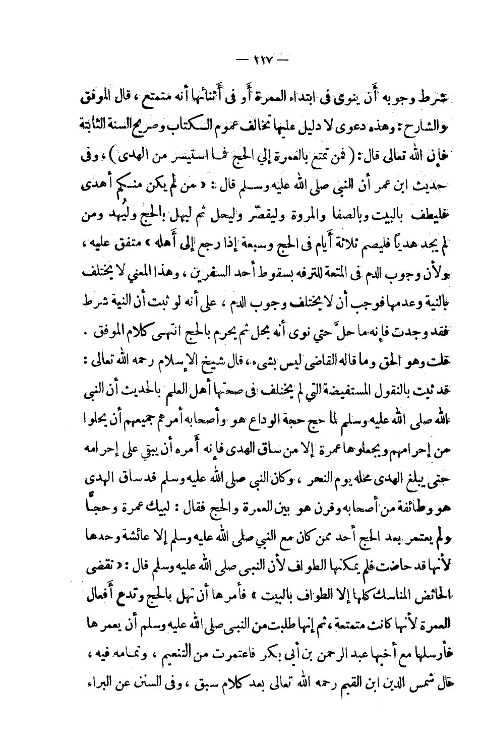 ولأن وجوب الدم في المتعة للترفه بسقوط أحد السفرين، وهذا المعنى لا يختلف بالنية وعدمها فوج بأن لا يختلف وجوب الدم، على أنه لو ثبت أن النية شرط فقد وجدت فإنه ما حل حتى نوى أنه يحل ثم يحرم بالحج انتهى كلام الموفق، قلت وهو الحق وما قاله القاضي ليس بشيء، قال شيخ الإسلام رحمه الله تعالى: قد ثبت بالنقول المستفيضة التي لم يختلف في صحتها أهل العلم بالحديث أن النبي صلى الله عليه وسلم لما حج حجة الوداع هو وأصحابه أمرهم جميعهم أن يحلوا من إحرامهم ويجعلوها عمرة إلا من ساق الهدي فإنه أمره أن يبقي على إحرامه حتى يبلغ الهدي محله يوم النحر، وكان النبي صلى الله عليه وسلم قد ساق الهدي هو وطائفة من أصحابه وقرن هو بين العمرة والحج فقال: لبيك عمرة وحجاً ولم يعتمر بعد الحج أحد ممن كان مع النبي صلى الله عليه وسلم إلا عائشة وحدها لأنها قد حاضت فلم يمكنها الطواف لأن النبي صلى الله عليه وسلم قال: (تقضي الحائض المناسك كلها إلا الطواف بالبيت) فأمرها أن تهل بالحج وتدع أفعال العمرة لأنها كانت متمتعة، ثم إنها طلبت من النبي صلى الله عليه وسلم أن يعمرها فأرسلها مع أخيها عبد الرحمن بن أبي بكر فاعتمرت من التنعيم، وتمامه فيه، قال شمس الدين ابن القيم رحمه الله تعالى بعد كلام سبق، وفي السنن عن البراء