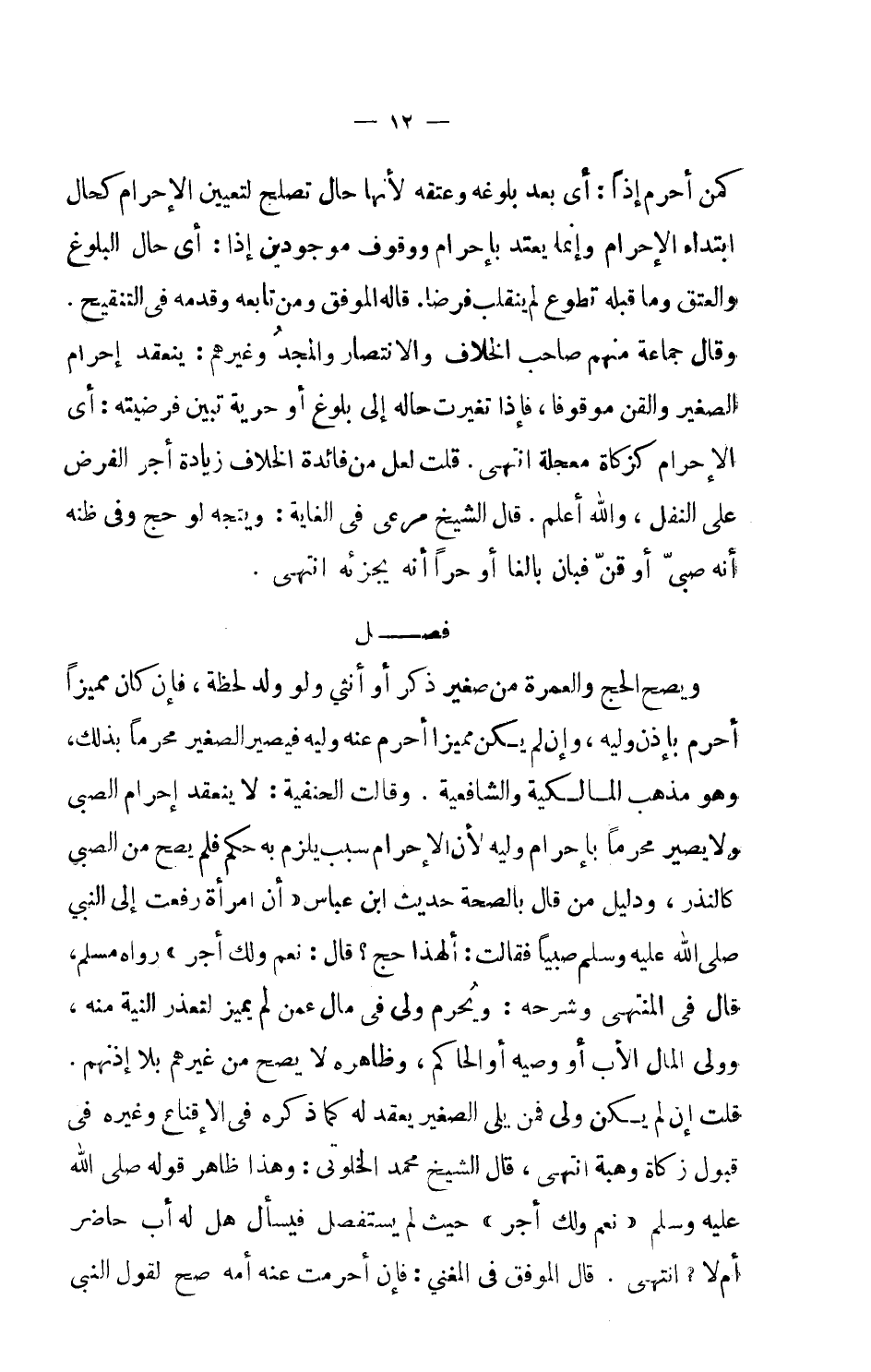 كمن أحرم إذاً: أي بعد بلوغه وعتقه لأنها حال تصح لتعيين الإحرام كحال ابتداء الإحرام وإنما يعتد بإحرام ووقوف موجودين، إذا: أي حال البلوغ والعتق وما قبله تطوع لم ينقلب فرضا. قاله الموفق ومن تابعه وقدمه في التنقيح. وقال جماعة منهم صاحب الخلاف والانتصار والمجد وغيرهم: ينعقد إحرام الصغير والقن موقوفا، فإذا تغيرت حاله إلى بلوغ أو حرية تبين فرضيته: أي الإحرام كزكاة معجلة انتهى.