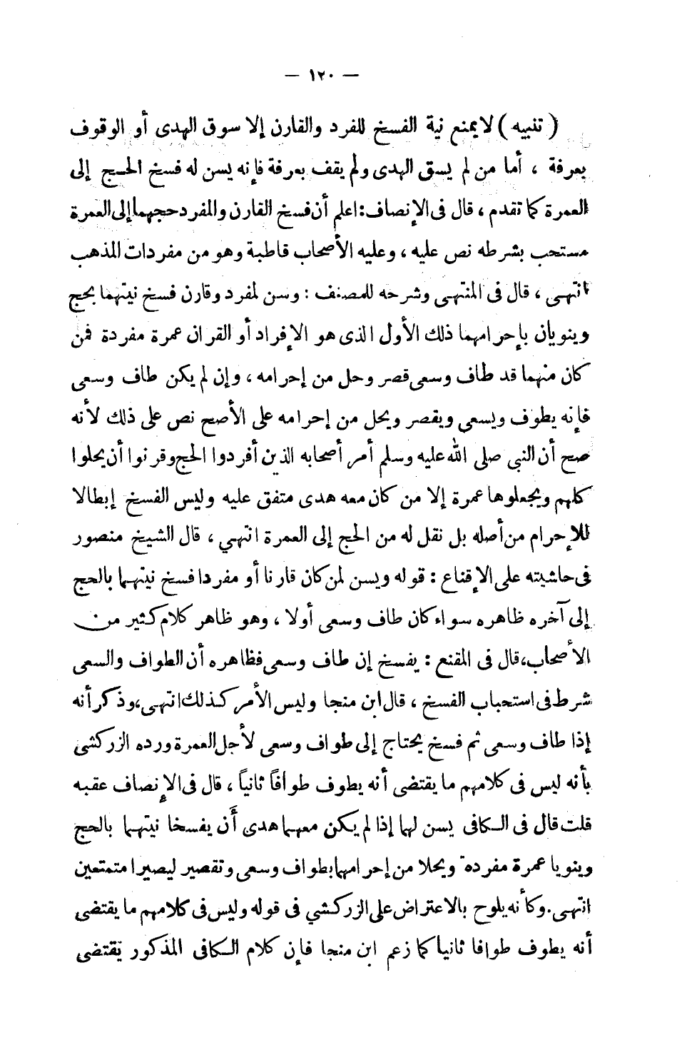(تنبيه) : لا يمنع نية الفسخ للمفرد والقارن إلا سوق الهدي أو الوقوف بعرفة، أما من لم يسق الهدي ولم يقف بعرفة فإنه يسن له فسخ الحج إلى العمرة كما تقدم، قال في الإنصاف: اعلم أن فسخ القارن والمفرد حجهما إلى العمرة مستحب بشرطه نص عليه. وعليه الأصحاب قاطبة وهو من مفردات المذهب انتهى.