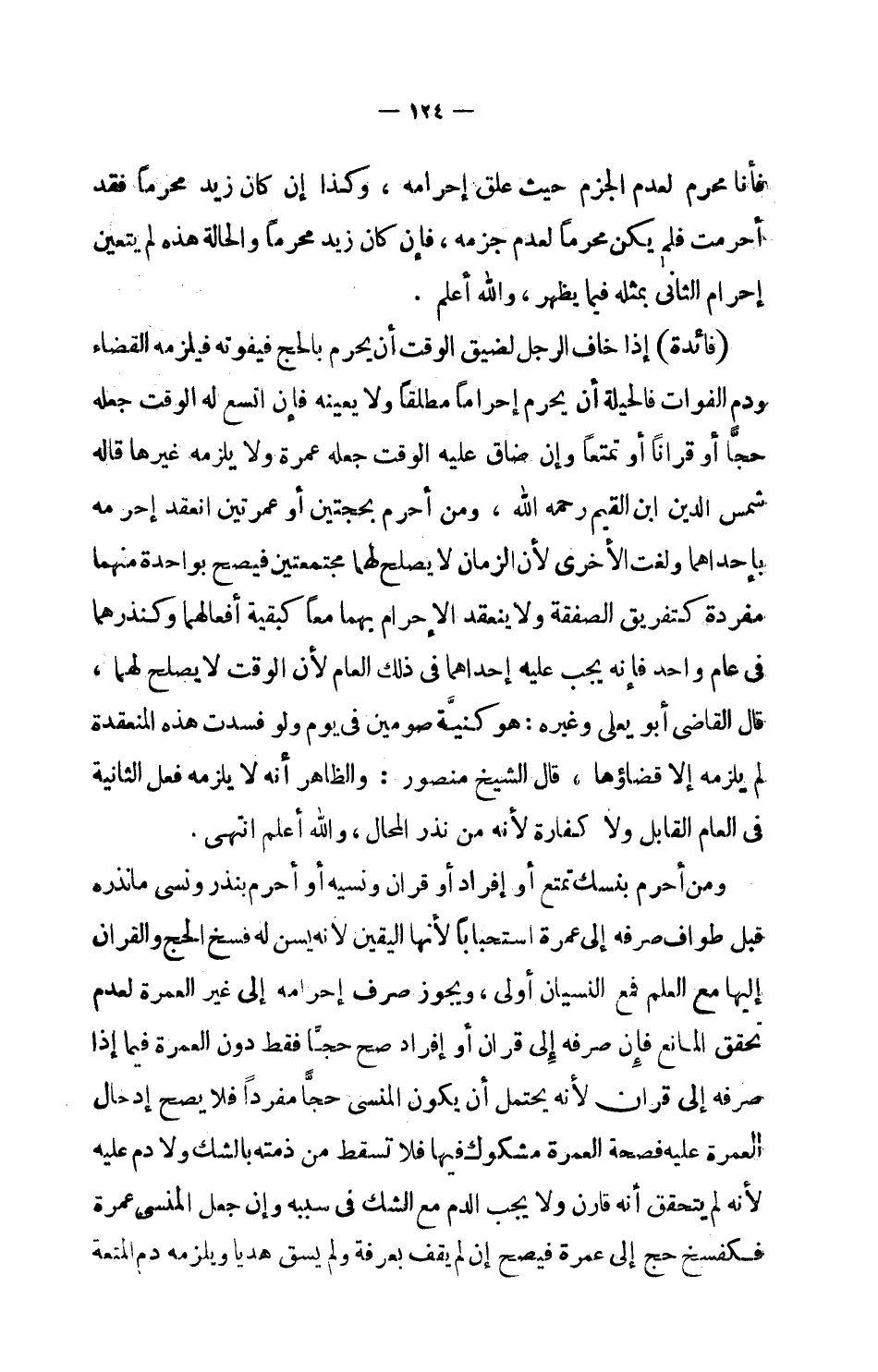 (فائدة) : إذا خاف الرجل لضيق الوقت أن يحرم بالحج فيفوته فيلزمه القضاء ودم الفوات فالحيلة أن يحرم إحراماً مطلقاً ولا يعينه فإن اتسع له الوقت جعله حجاً أو قراناً أو تمتعاً وإن ضاق عليه الوقت جعله عمرة ولا يلزمه غيرها قاله شمس الدين ابن القيم رحمه الله، ومن أحرم بحجتين أو عمرتين انعقد إحرامه بإحداهما ولغت الأخرى لأن الزمان لا يصلح لهما مجتمعتين فيصح بواحدة منهما مفردة كتفريق الصفقة ولا ينعقد الإحرام بهما معاً كبقية أفعالهما وكنذرهما في عام واحد فإنه يجب عليه إحداهما في ذلك العام لأن الوقت لا يصلح لهما، قال القاضي أبو يعلى وغيره: هو كنية صومين في يوم ولو فسدت هذه المنعقدة لم يلزمه إلا قضاؤها، قال الشيخ منصور: والظاهر أنه لا يلزمه فعل الثانية في العام القابل ولا كفارة لأنه من نذر المحال، والله أعلم انتهى.