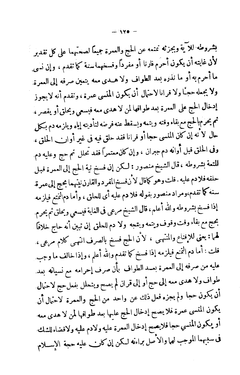 بشروطه، قال الشيخ منصور: لكن إن فسخ نية الحج إلى العمر قبل حلقه فلا دم عليه.