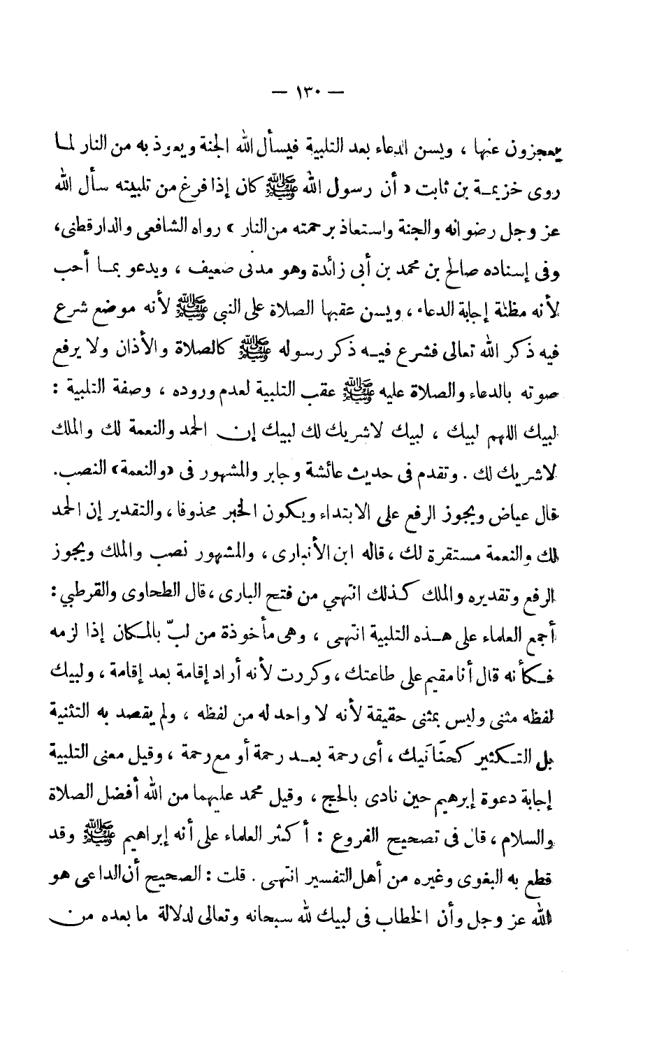 يعجزون عنها، ويسن الدعاء بعد التلبية فيسأل الله الجنة ويعوذ به من النار لما روى خزيمة بن ثابت (أن رسول الله صلى الله عليه وسلم كان إذا فرغ من تلبيته سأل الله عز وجل رضوانه الجنة واستعاذ برحمته من النار) رواه الشافعي والدارقطني، وفي إسناده صالح بن محمد بن أبي زائدة وهو مدني ضعيف، ويدعو بما أحب لأنه مظنة إجابة الدعاء، ويسن عقبها الصلاة على النبي صلى الله عليه وسلم لأنه موضع شرع فيه ذكر الله تعالى فشرع فيه ذكر رسوله صلى الله عليه وسلم كالصلاة والأذان ولا يرفع صوته بالدعاء والصلاة عليه صلى الله عليه وسلم عقب التلبية لعدم وروده، وصفة التلبية: لبيك اللهم لبيك، لبيك لا شريك لك لبيك إن الحمد والنعمة لك والملك لا شريك لك.
