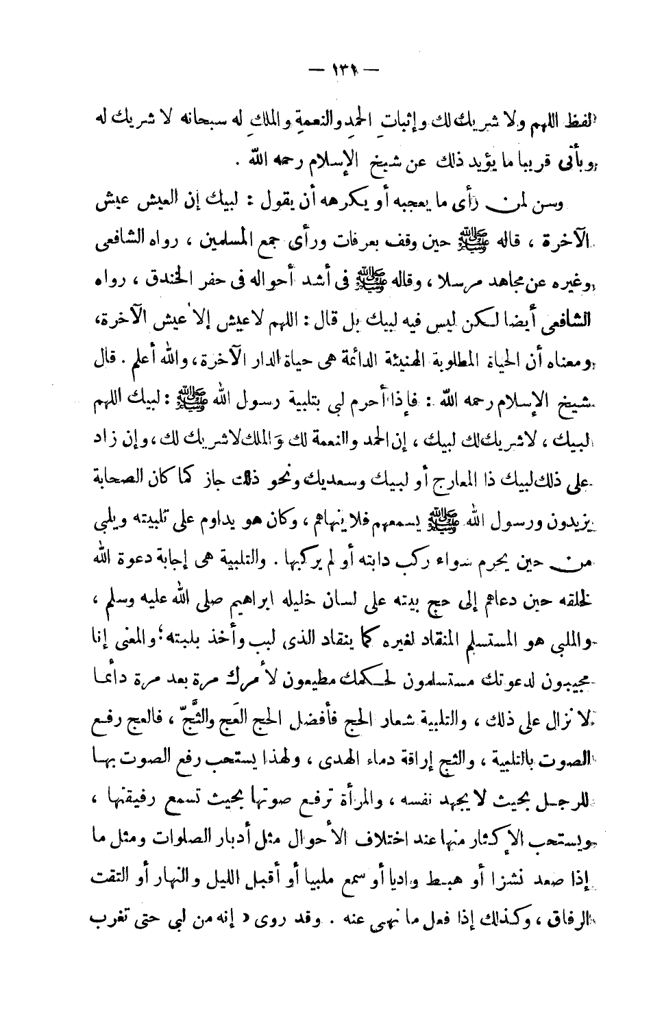 قال شيخ الإسلام رحمه الله: فإذا أحرم لبى بتلبية رسول الله صلى الله عليه وسلم: لبيك اللهم لبيك، لبيك لا شريك لك لبيك، إن الحمد والنعمة لك والملك لا شريك لك، وإن زاد على ذلك لبيك ذا المعارج أو لبيك وسعديك ونحو ذلك جاز كما كان الصحابة يزيدون ورسول الله صلى الله عليه وسلم يسمعهم فلا ينهاهم، وكان هو يداوم على تلبيته ويلبي من حين يحرم سواء ركب دابته أو لم يركبها، والتلبية هي إجابة دعوة الله لخلقه حين دعاهم إلى حج بيته على لسان خليله إبراهيم صلى الله عليه وسلم، والملبي هو المستسلم المنقاد لغيره كما ينقاد الذي لبب وأخذ بلبته؛ والمعنى إنا مجيبون لدعوتك مستسلمون لحكمك مطيعون لأمرك مرة بعد مرة دائماً لا نزال على ذلك، والتلبية شعار الحج فأفضل الحج العَج والثَّج، فالعج رفع الصوت بالتلبية، والثج إراقة دماء الهدي، ولهذا يستحب رفع الصوت بها للرجل بحيث لا يجهد نفسه، والمرأة ترفع صوتها بحيث تسمع رفيقتها، ويستحب الإكثار منها عند اختلاف الأحوال مثل أدبار الصلوات ومثل ما إذا صعد نشزا أو هبط واديا أو سمع ملبيا أو أقبل الليل والنهار أو التقت الرفاق، وكذلك إذا فعل ما نهى عنه.