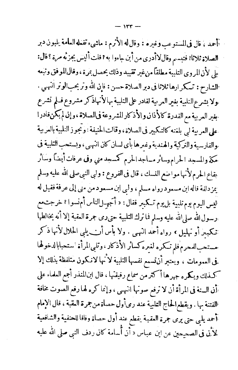 ولا تشرع التلبية بغير العربية لقادر على التلبية بها لأنها ذكر مشروع فلم تشرع بغير العربية مع القدرة كالآذان والأذكار المشروعة في الصلاة، وإن لم يكن قادرا على العربية لبى بلغته كالتكبير في الصلاة، وقالت الحنفية: وتجوز التلبية بالعربية والفارسية والتركية والهندية وغيرها بأن لسان كان انتهى.