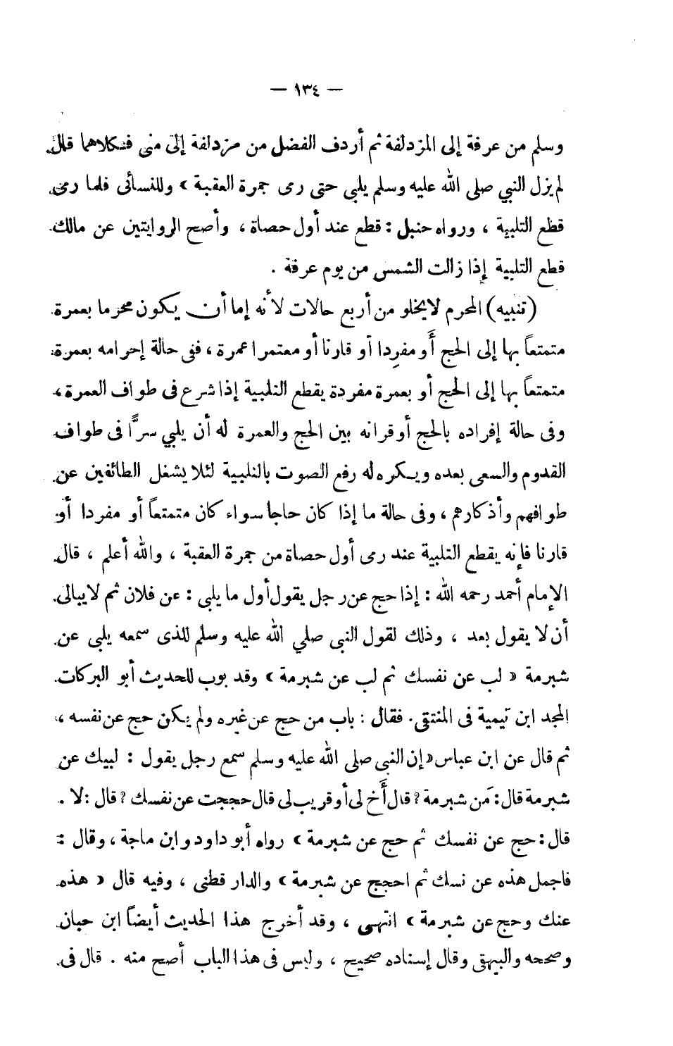 (تنبيه) : المحرم لا يخلو من أربع حالات لأنه إما أن يكون محرما بعمرة متمتعا بها إلى الحج أو مفرداً أو قارنا أو معتمرا عمرة، ففي حالة إحرامه بعمرة متمتعاً بها إلى الحج أو بعمرة مفردة يقطع التلبية إذا شرع في طواف العمرة، وفي حالة إفراده بالحج أو قرانه بين الحج والعمرة له أن يلبي سراً في طواف القدوم والسعي بعده ويكره له رفع الصوت بالتلبية لئلا يشغل الطائفين عن طوافهم وأذكارهم، وفي حالة ما إذا كان حاجاً سواء كان متمتعاً أو مفردا أو قارنا فإنه يقطع التلبية عند رمي أول حصاة من جمرة العقبة، والله أعلم، قال الإمام أحمد رحمه الله: إذا حج عن رجل يقول أول ما يلبي: عن فلان ثم لا يبالي أن لا يقول بعد، وذلك لقول النبي صلى الله عليه وسلم للذي سمعه يلبي عن شبرمة (لب عن نفسك ثم لب عن شبرمة) وقد بوب للحديث أبو البركات المجد ابن تيمية في المنتقى. فقال: باب من حج عن غيره ولم يكن حج عن نفسه، ثم قال عن ابن عباس: (إن النبي صلى الله عليه وسلم سمع رجلاً يقول: لبيك عن شبرمة قال: مَن شبرمة؟ قال أخ لي أو قريب لي قال حججت عن نفسك؟ قال: لا، قال: حج عن نفسك ثم حج عن شبرمة) . رواه أبو داود وابن ماجة، وقال: فاجعل هذه عن نفسك ثم احجج عن شبرمة، والدارقطني، وفقيه قال: (هذه عنك وحج عن شبرمة) . انتهى، وقد أخرج هذا الحديث أيضاً ابن حبان وصححه والبيهقي وقال إسناده صحيح، وليس في هذا الباب أصح منه.