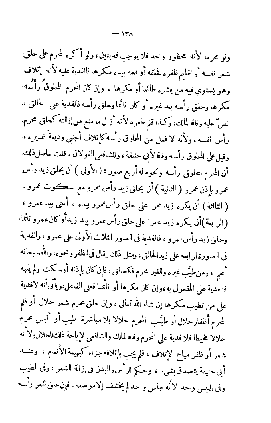 الرابعة: أن يكره زيد عمرا على حلق رأس عمرو بيد زيد أو كان عمرو نائماً وحلق زيد رأس عمرو، فالفدية في الصور الثلاث الأولى على عمرو، والفدية في الصورة الرابعة على زيد الحالق، ومثل ذلك يقال في الظفر ونحوه، والله سبحانه أعلم، ومن طيِّب غيره والغير محرم فكحالق، فإن كان بإذنه أو سكت ولم ينهه فالفدية على المفعول به، وإن كان مركها أو نائما فعلى الفاعل، ويأتي أنه لا فدية على من تطيب مركها إن شاء الله تعالى، وإن حلق محرم شعر حلال أو قلم المحرم أظفار حلال أو طيب المحرم حلالا بلا مباشر طيب أو ألبس محرم حلالا مخيطا فلا فدية على المحرم وفاقاً لمالك والشافعي لإباحة ذلك للحلال ولأنه شعر أو ظفر مباح الإتلاف، فلم يجب بإتلافه جزاء كبهيمة الأنعام، وعند أبي حنيفة يتصدق بشيء.