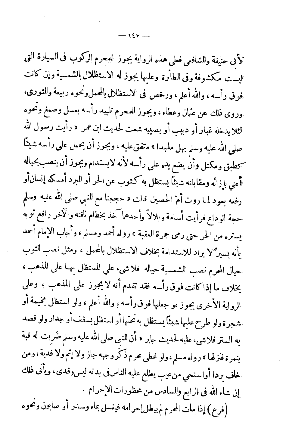 لأبي حنيفة والشافعي فعلى هذه الرواية يجوز للمحرم الركوب في السيارة التي ليست مكشوفة وفي الطائرة وعليها يجوز له الاستظلال بالشمسية وإن كان فوق رأسه، والله أعلم. ورخص في الاستظلال بالمحمل ونحوه ربيعة والثوري، وروي ذلك عن عثمان وعطاء، ويجوز للمحرم تلبيد رأسه بعسل وصمغ ونحوه لئلا يدخله غبار أو دبيب أو يصيبه شعث لحديث ابن عمر (رأيت رسول الله صلى الله عليه وسلم يهل ملبداً) متفق عليه. ويجوز أن يحمل على رأسه شيئاً كطبق ومكتل وأن يضع يده على رأسه لأنه لا يستدام ويجوز أن ينصب بحياله أعتي بإزائه ومقابلته شيئاً يستظل به كثوب عن الحر أو البرد أمسكه إنسان أو رفعه بعود لما روت أم الحصين قالت (حججنا مع النبي صلى الله عليه وسلم حجة الوداع فرأيت أسامة وبلالاً وأحدهما آخذ بخطام ناقته والآخر رافع ثوبه يستره من الحر حتى رمى جمرة العقبة) رواه أحمد ومسلم، وأجاب الإمام أحمد بأنه يسير لا يراد للاستدامة بخلاف الاستظلال بالمحمل، ومثل نصب الثوب حيال المحرم نصب الشمسية حياله فلا شيء على المستظل بها على المذهب، بخلاف ما إذا كانت فوق رأسه فقد تقدم أنه لا يجوز على المذاهب، وعلى الرواية الأخرى يجوز ولو جعلها فوق رأسه، والله أعلم، ولو استظل بخيمة أو شجرة ولو طرح عليها شيئاً يستظل به تحتها أو استظل بسقف أو جدار ولو قصد به الستر فلا شيء عليه لحديث جابر (أن النبي صلى الله عليه وسلم ضربت له قبة بنمرة فنزلها) رواه مسلم، ولو غطى محرم ذكر وجهه جاز ولا إثم ولا فدية، ومن خاف برداً أو استحى من عيب يطلع عليه الناس في بدنه لبس وفدي، ويأتي ذلك إن شاء الله في الرابع والسادس من محظورات الإحرام.