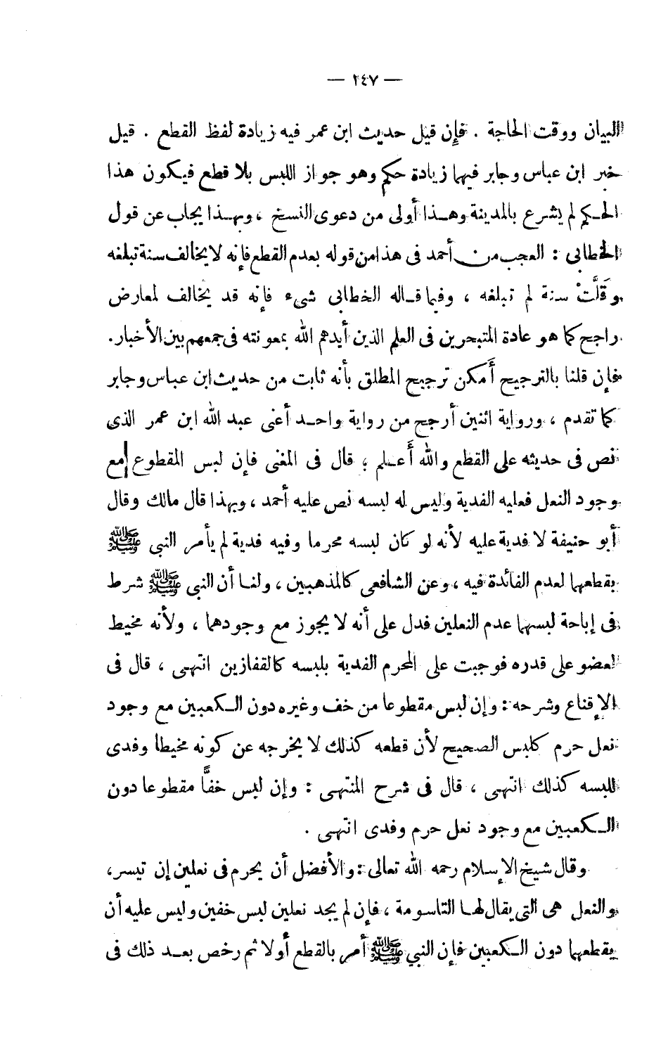 قيل خبر ابن عباس وجابر فيهما زيادة حكم وهو جواز اللبس بلا قطع فيكون هذا الحكم لم يشرع بالمدينة وهذا أولى من دعوى النسخ، وبهذا يجاب عن قول الخطابي: العجب من أحمد في هذا من قوله بعدم القطع فإنه لا يخالف سنة تبلغه وقلَّت سنة لم تبلغه، وفيما قاله الخطابي شيء فإنه قد يخالف لمعارض راجح كما هو عادة المتبحرين في العلم الذين أيدهم الله بمعونته في جمعهم بين الأخبار، فإن قلنا بالترجيح أمكن ترجيح المطلق بأنه ثابت من حديث ابن عباس وجابر كما تقدم، ورواية اثنين أرجح من رواية واحد أعني عبد الله بن عمر الذي نص في حديثه على القطع والله أعلم، قال في المغني فإن لبس المقطوع مع وجود النعل فعليه الفدية وليس له لبسه نص عليه أحمد، وبهذا قال مالك وقال أبو حنيفة لا فدية عليه لأنه لو كان لبسه محرماً وفيه فدية لم يأمر النبي صلى الله عليه وسلم بقطعهما لعدم الفائدة فيه، وعن الشافعي كالمذهبين، ولنا أن النبي صلى الله عليه وسلم شرط في إباحة لبسهما عدم النعلين فدل على أنه لا يجوز مع وجودها، ولأنه مخيط العضو على قدره فوجبت على المحرم الفدية يلبسه كالقفازين انتهى. قال في الإقناع وشرحه: وإن لبس مقطوعاً من خف وغيره دون الكعبين مع وجود نعل حرم كلبس الصحيح لأن قطعه كذلك لا يخرجه عن كونه مخيطاً وفدى للبسه كذلك انتهى. قال في شرح المنتهى. وإن لبس خفاً مقطوعاً دون الكعبين مع وجود نعل حرم وفدى انتهى.